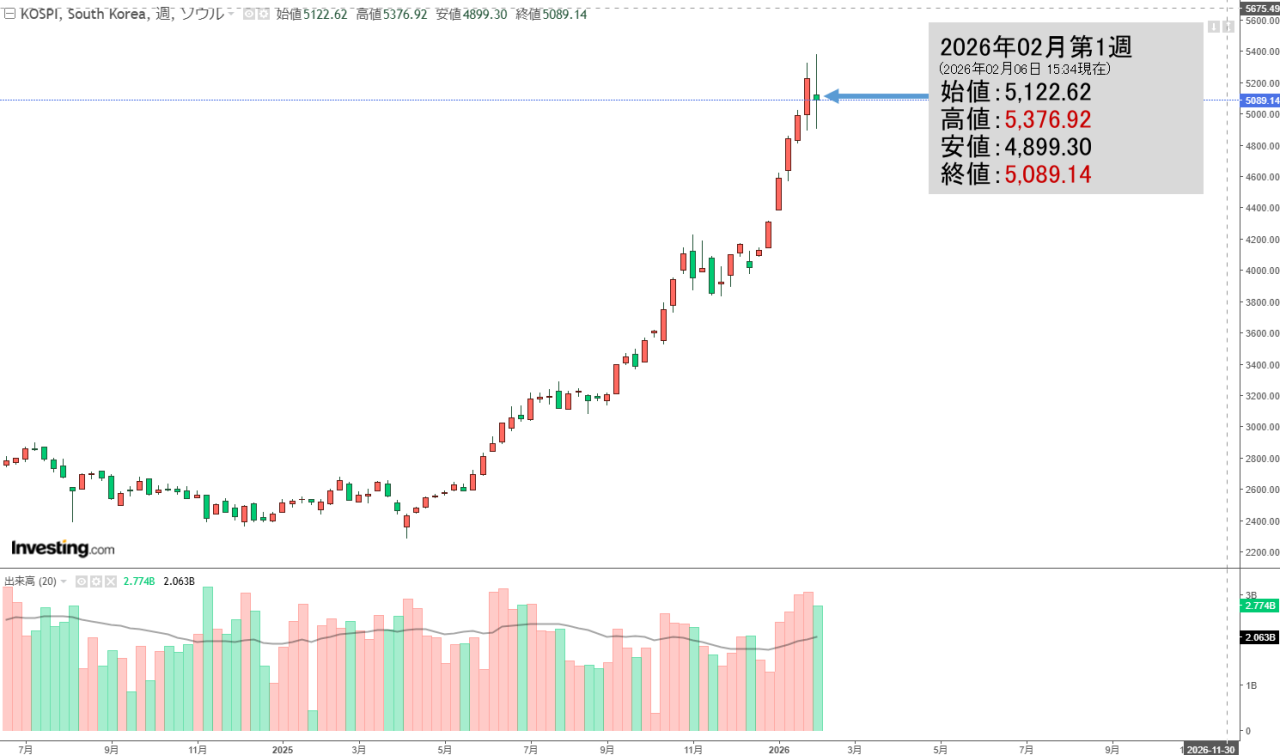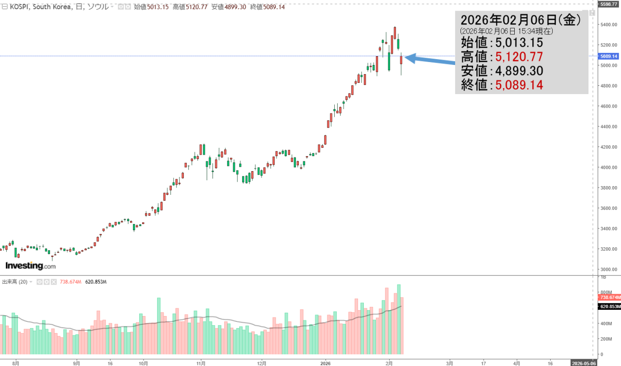 2026年02月06日(金)の韓国株式市場が締まりました。15:34現在、KOSPI(韓国総合株価指数)のチャートは以下のようになっています(チャートは『Investing.com』より引用)。