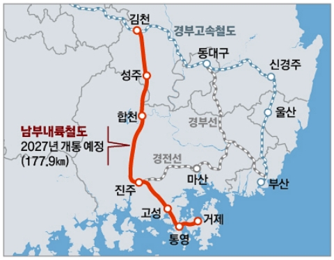 慶尚南道の巨済から固城郡を経て慶尚北道の金泉までを結びます。金泉で既存の高速鉄道KTXと接続します。