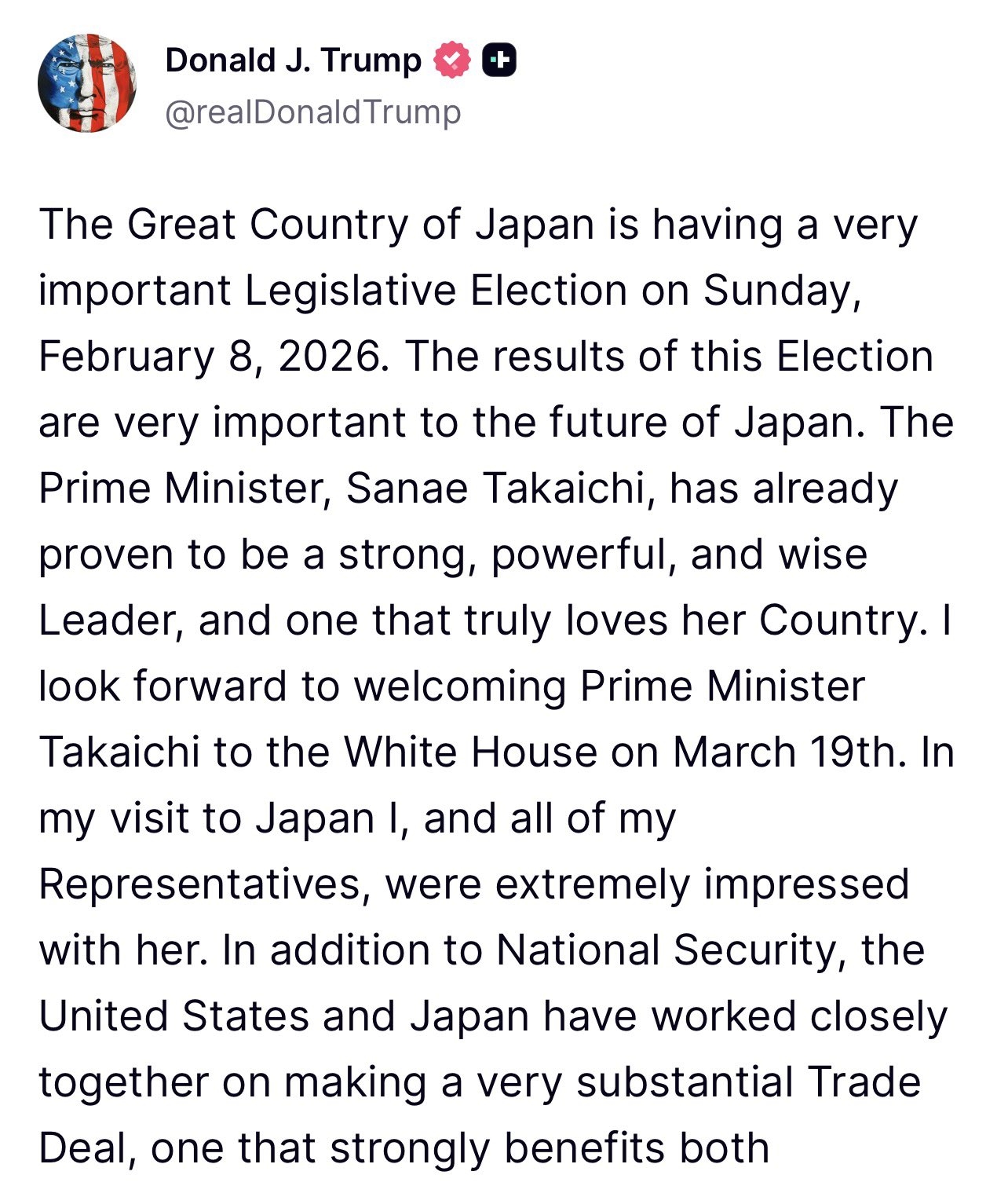 I look forward to welcoming Prime Minister Takaichi to the White House on March 19th. In my visit to Japan I, and all of my Representatives, were extremely impressed with her.