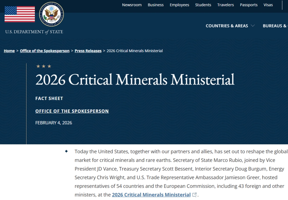 マルコ・ルビオ国務長官は、J.D.ヴァンス副大統領、スコット・ベッセント財務長官、ダグ・バーガム内務長官、クリス・ライト・エネルギー長官、ならびに米国通商代表部(USTR)のジェイミソン・グリア大使とともに、54カ国および欧州委員会の代表団を主催し、外国およびその他の閣僚43名を含む代表者が2026年重要鉱物閣僚会議に出席した。