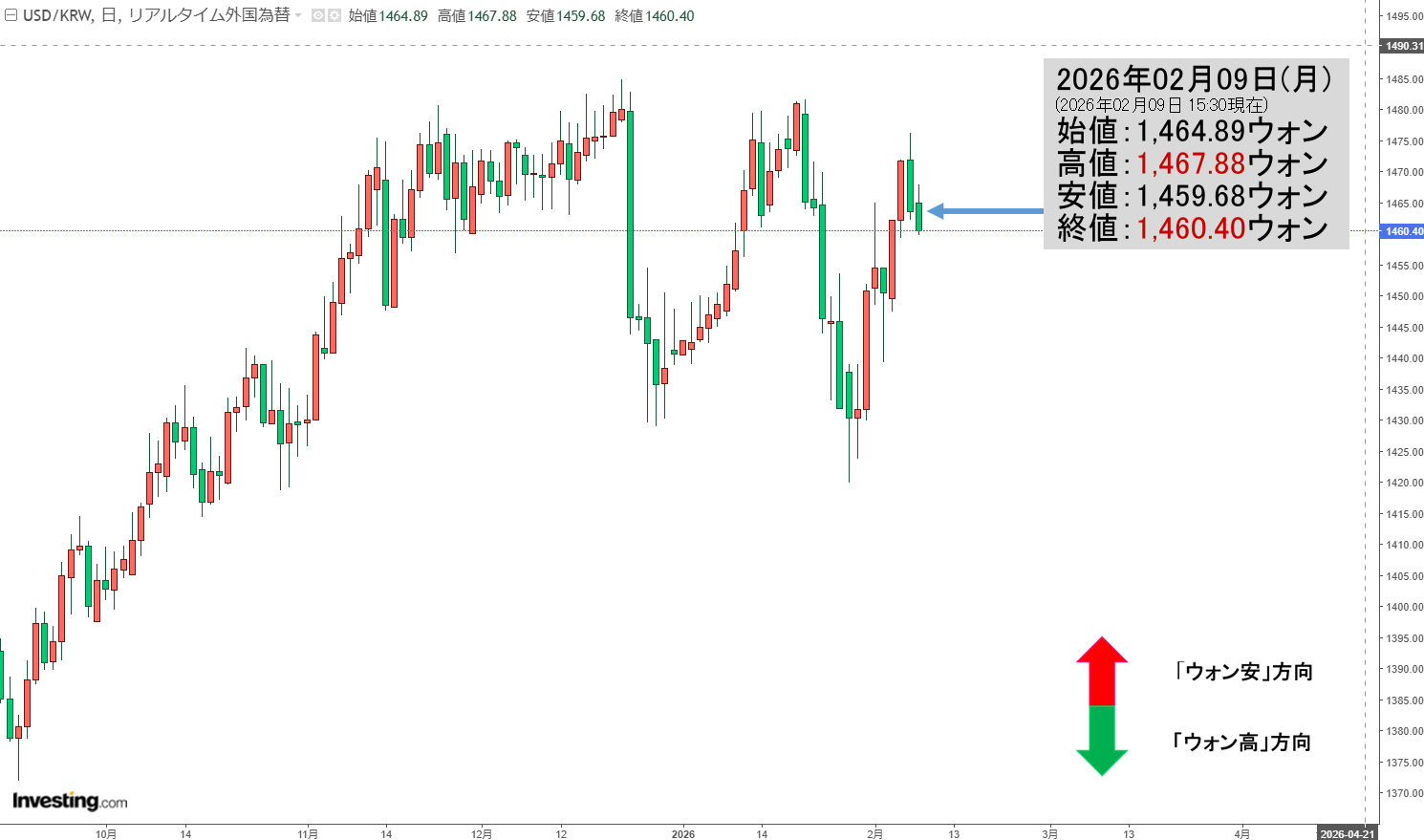 残念ながら陰線が伸びました。現在のところ「1ドル=1,460ウォン」近辺の攻防となっています。