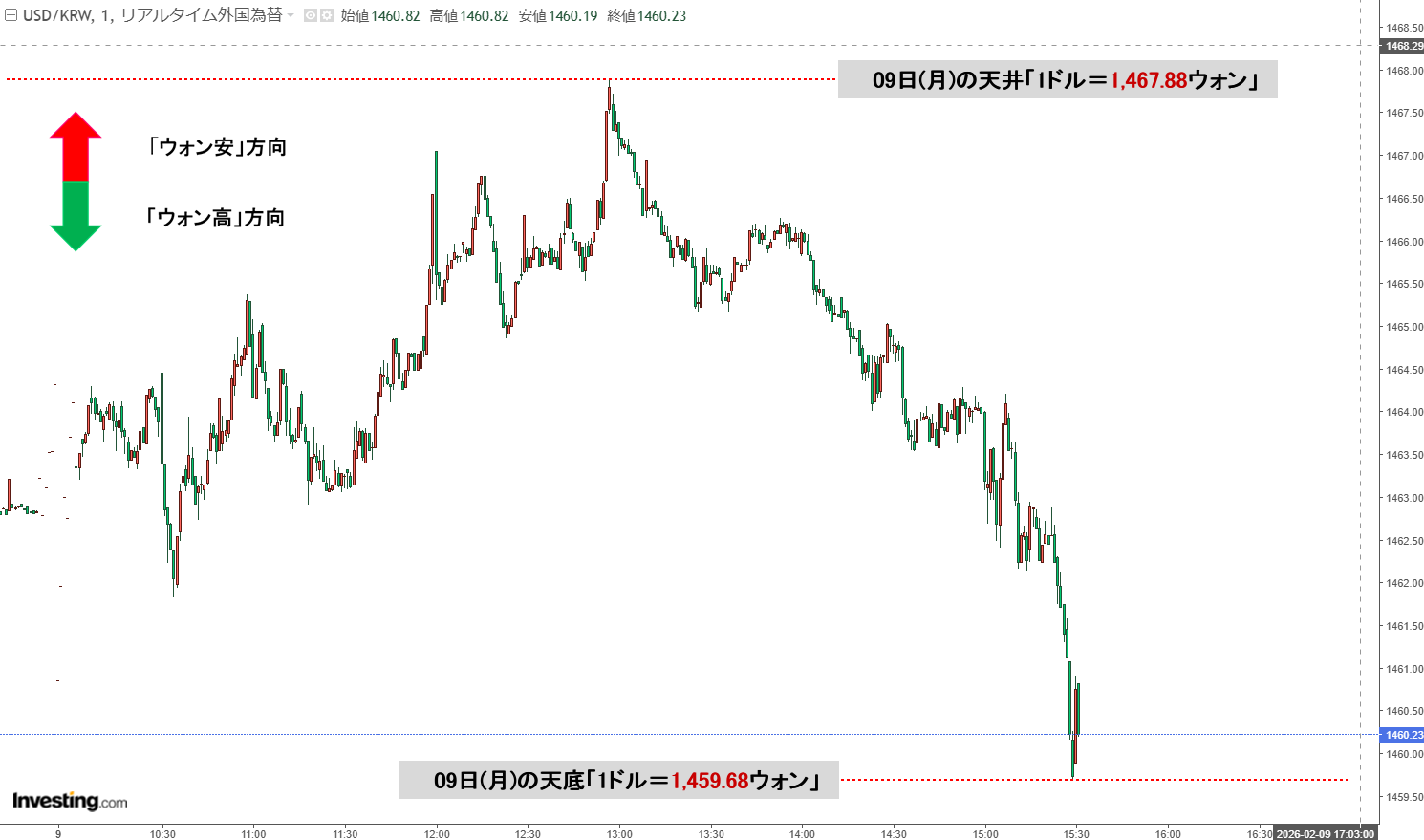 2026年02月09日(月)の韓国時間※が終わりました。15:30現在、ドルウォンのチャートは以下のようになっています(チャートは『Investing.com』より引用)。