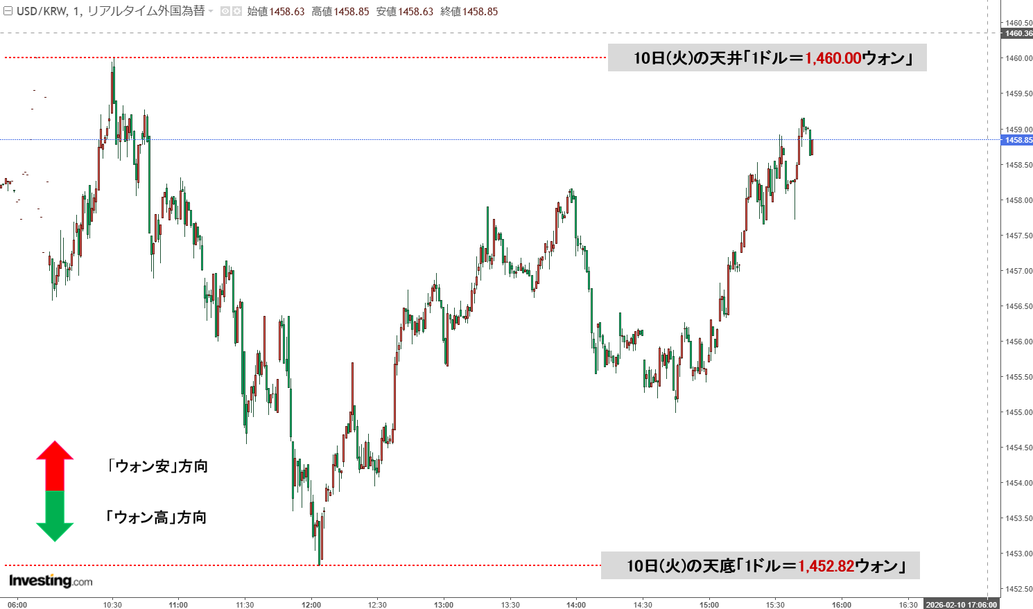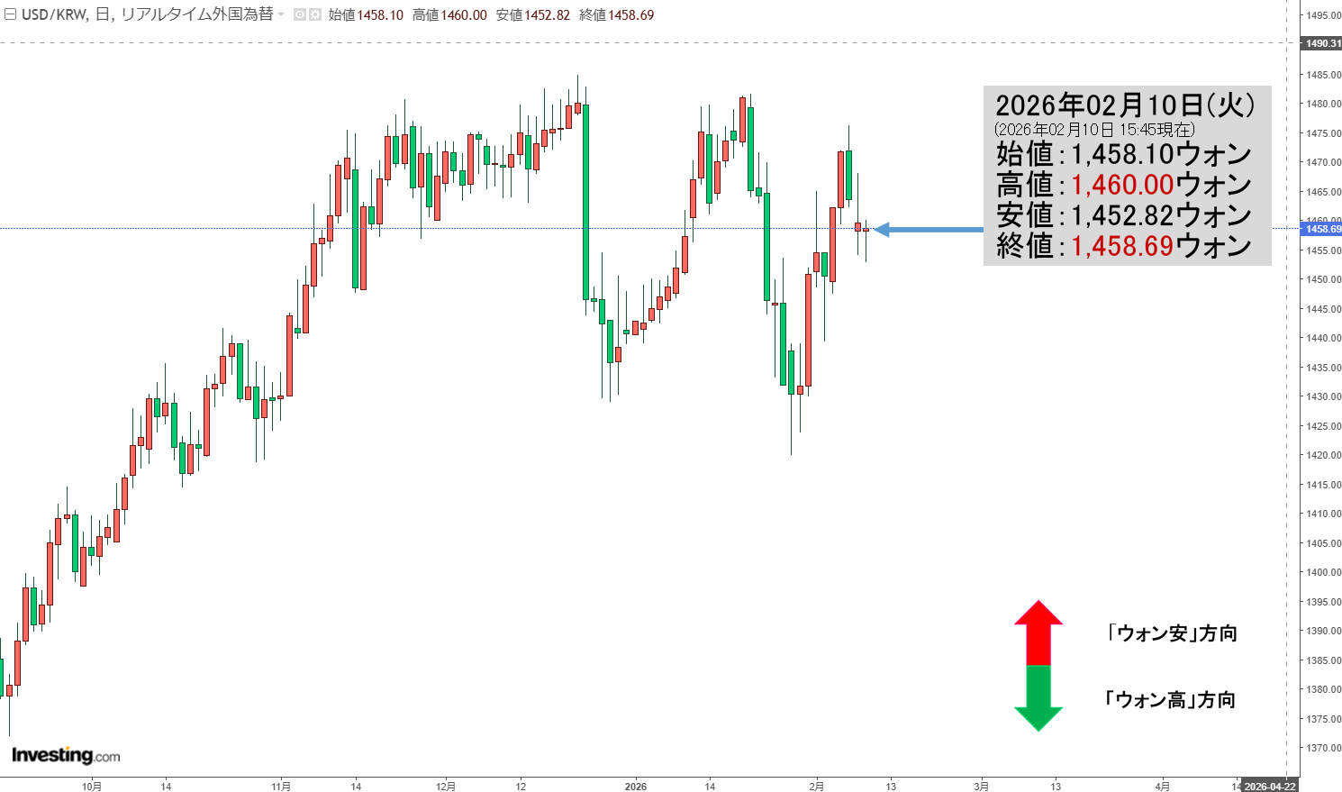 トピック2026年02月10日(火)15:45現在、ドルウォンのチャートは以下のようになっています(チャートは『Investing.com』より引用)。