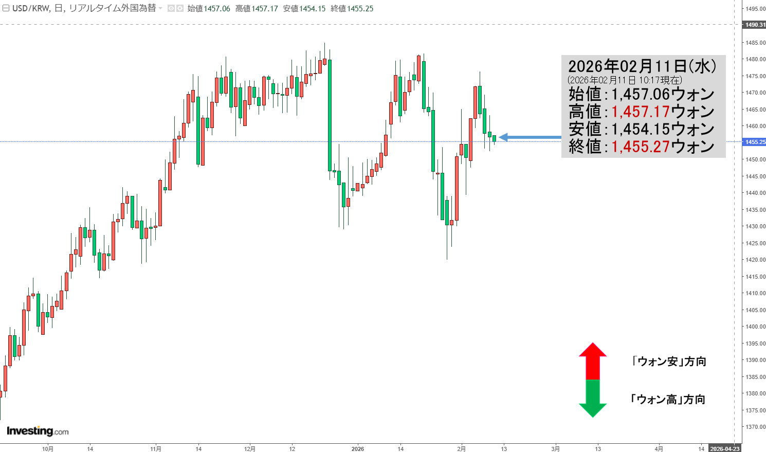トピック2026年02月11日(水)の市場が開きました。10:17現在、ドルウォンのチャートは以下のようになっています(チャートは『Investing.com』より引用)。