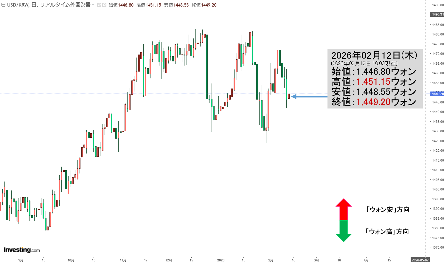 現在のところ「1ドル=1,449ウォン」近辺の攻防となっています。
