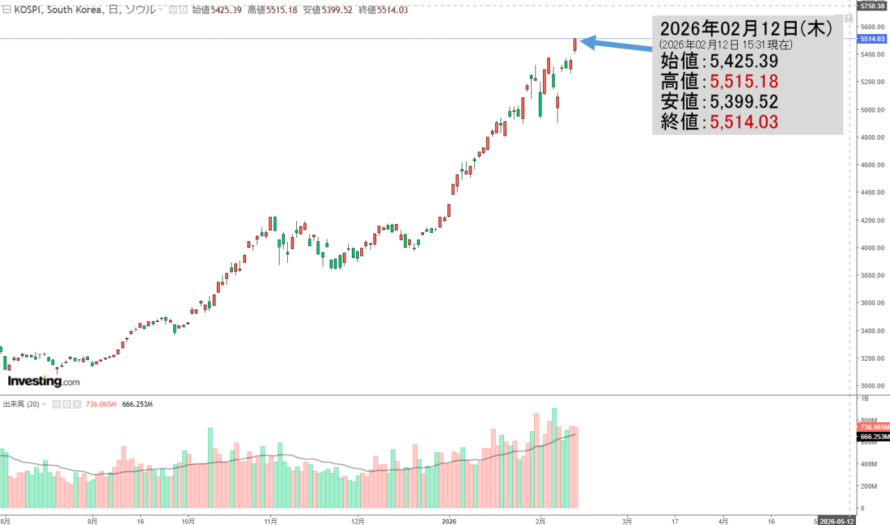 2026年02月12日(木)の韓国株式市場が締まりました。15:31現在、KOSPI(韓国総合株価指数)のチャートは以下のようになっています(チャートは『Investing.com』より引用)。