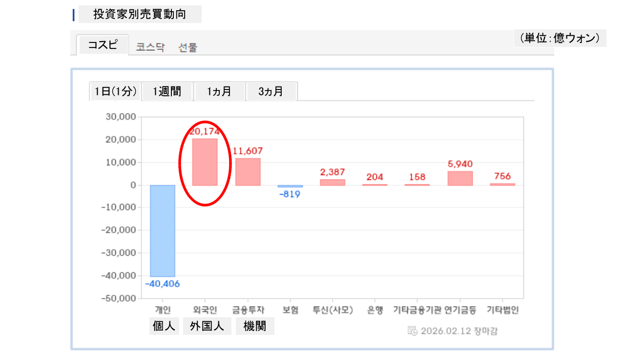 個人投資家は「4兆406億ウォン」の売り越し、外国人投資家は「2兆174億ウォン」の買い越しです。