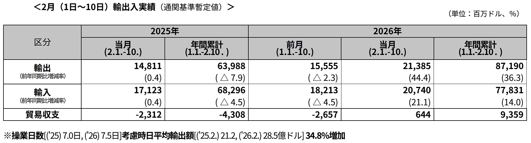 ⇒参照・引用元:『韓国 関税庁』公式サイト「2026年02月1~2月10日 輸出入の現況 [暫定値]」