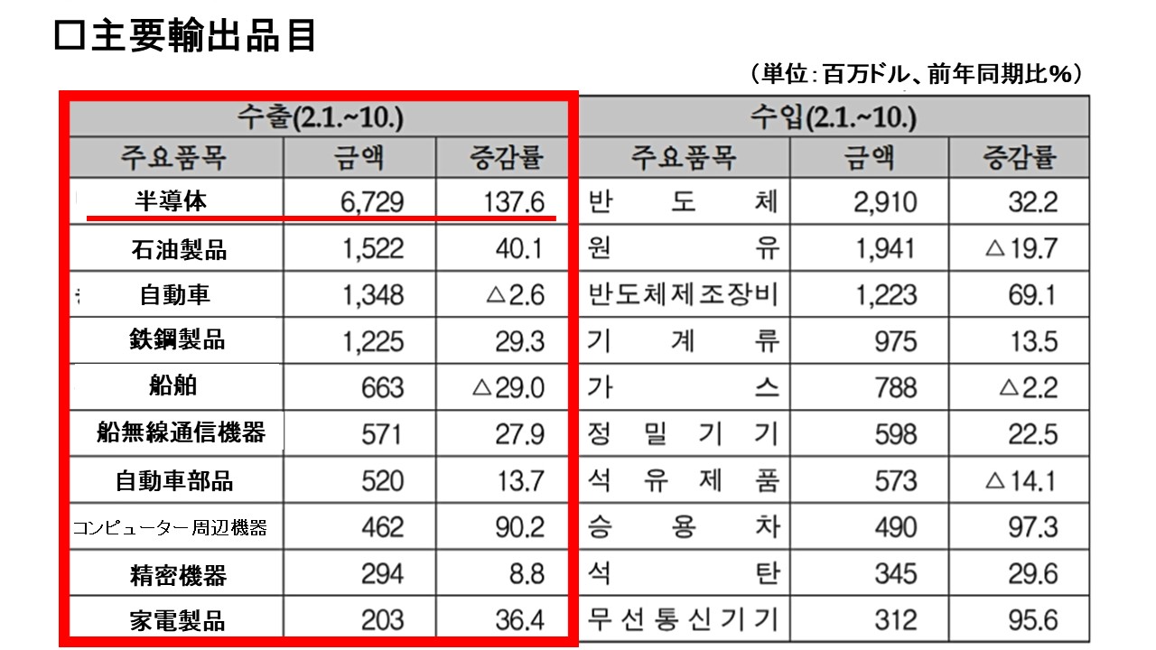 半導体の輸出金額が約2.4倍に増加し、大きな貿易黒字を叩き出しています。
