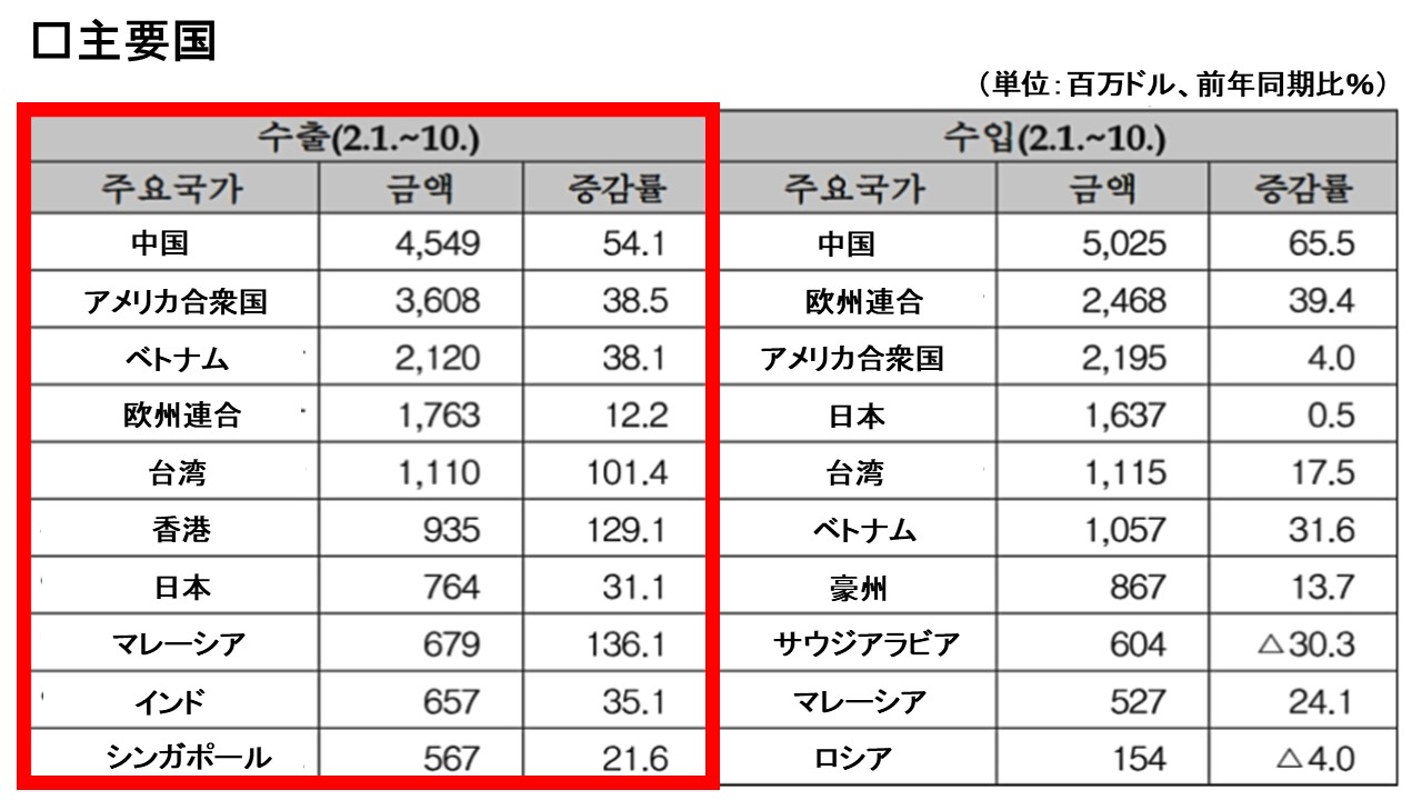 対前年同期比で対中国が「+54.1%」、対合衆国が「+38.5%」も増加しています。