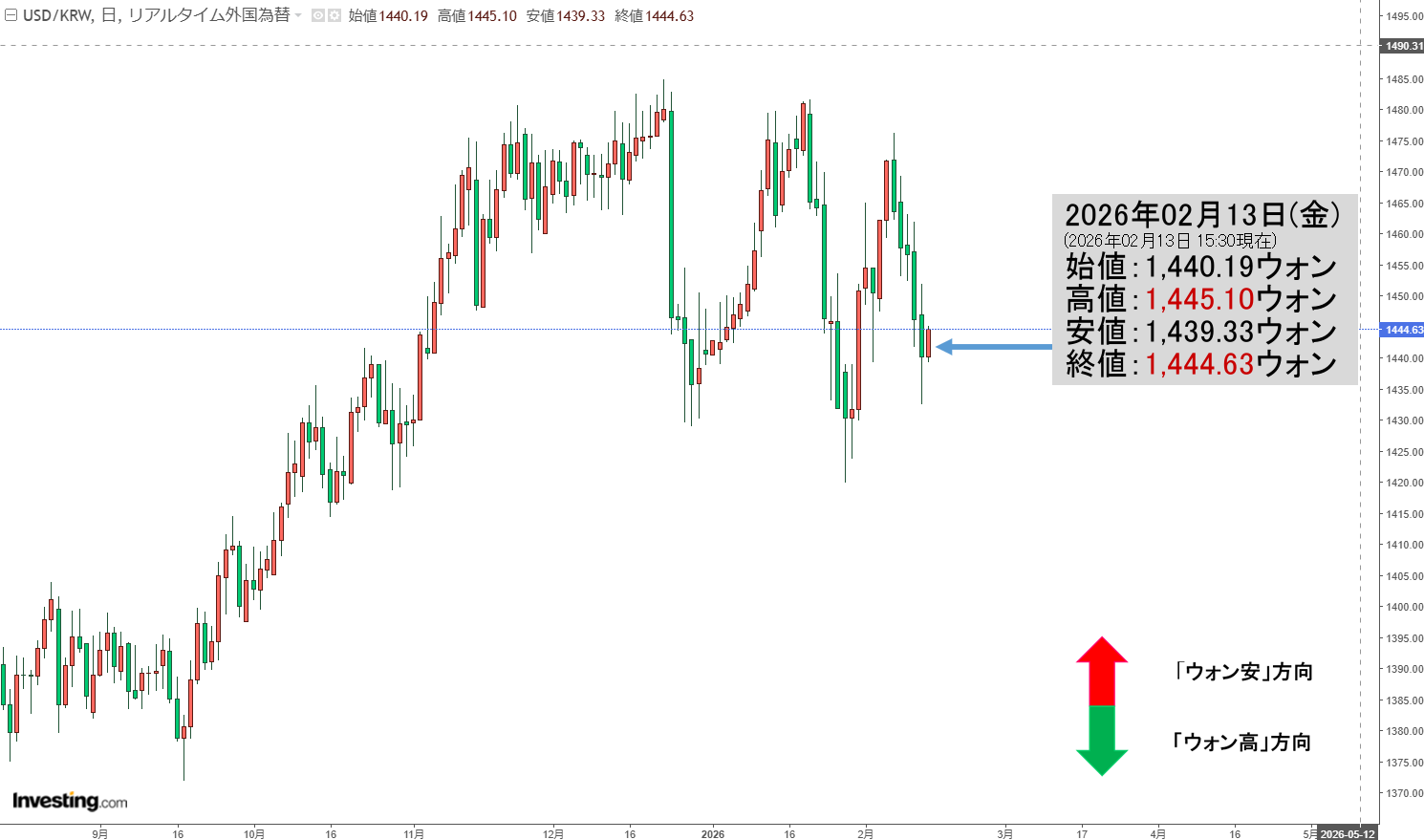 2026年02月13日(金)15:30現在、ドルウォンのチャートは以下のようになっています(チャートは『Investing.com』より引用)。