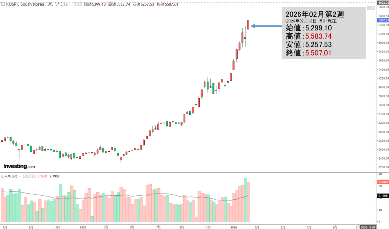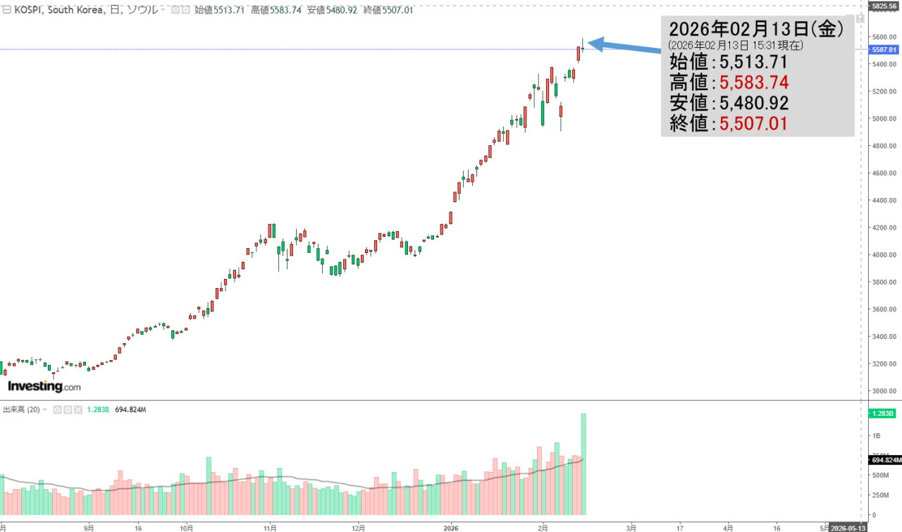2026年02月13日(金)の韓国株式市場が締まりました。15:31現在、KOSPI(韓国総合株価指数)のチャートは以下のようになっています(チャートは『Investing.com』より引用)。