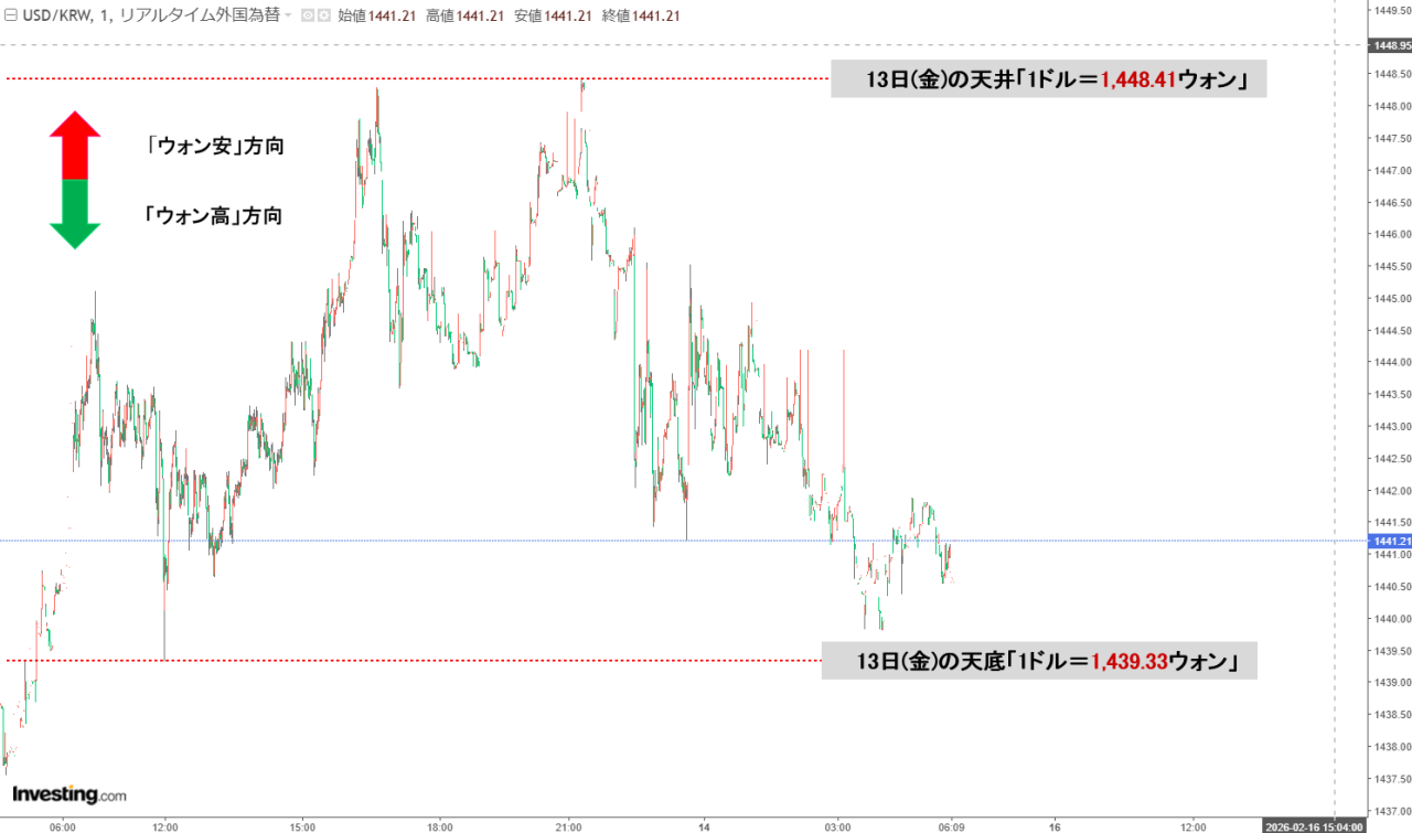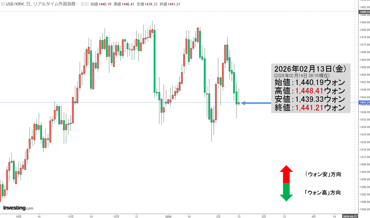 2026年02月13日(金)が(ほぼほぼ)締まりました。2026年02月14日 08:18現在、ドルウォンチャートは以下のようになっています(チャートは『Investing.com』より引用:以下同)。