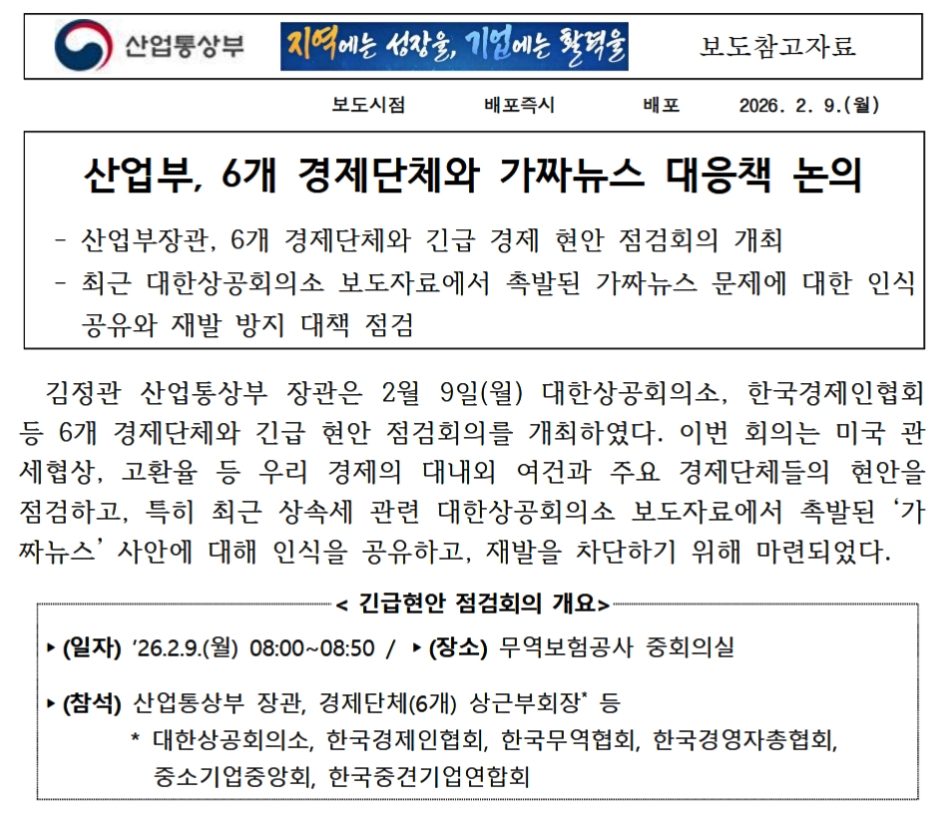 産業部は、大韓商工会議所の当該報道資料の作成・検証・配布の全過程について即時に監査に着手しており、今後の監査結果に応じて担当者の問責、法的措置など厳重に責任を問う計画であると明らかにした。