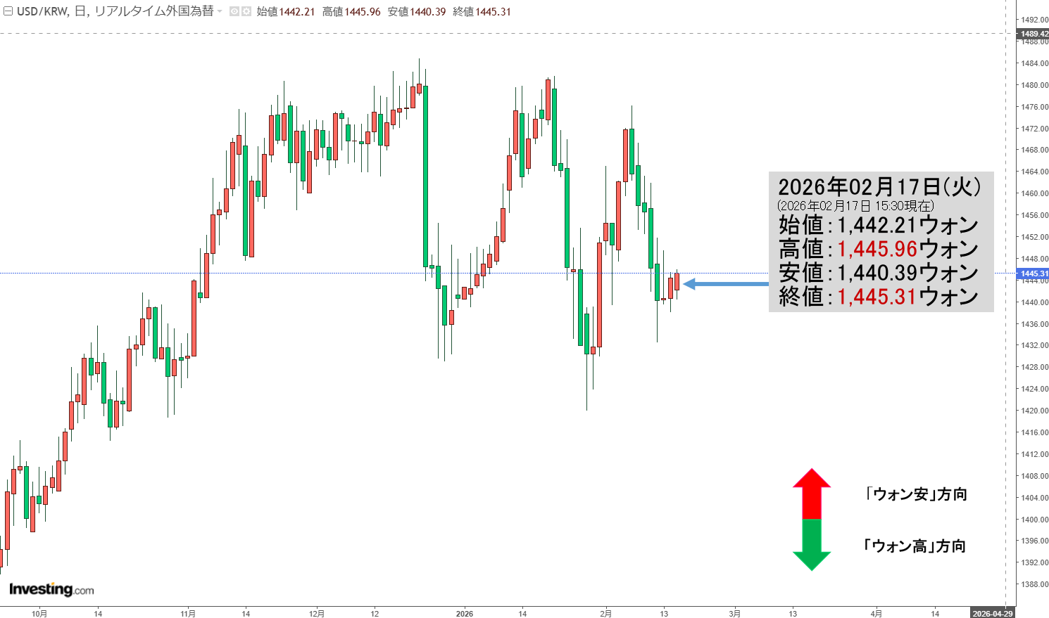 2026年02月17日(火)の韓国時間※が終わりました。15:30現在、ドルウォンのチャートは以下のようになっています(チャートは『Investing.com』より引用)。
