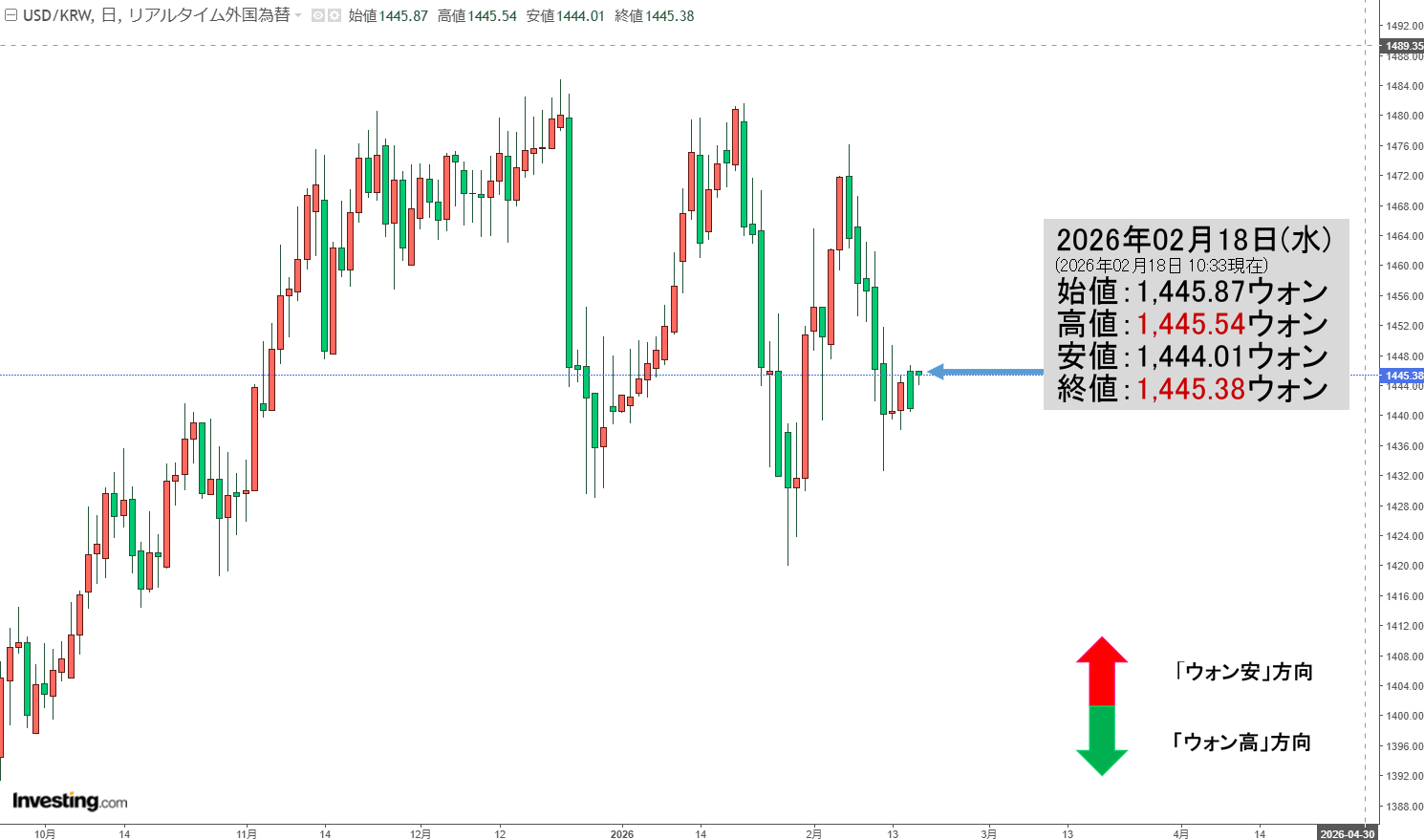 2026年02月18日(水)の市場が開きました。10:33現在、ドルウォンのチャートは以下のようになっています(チャートは『Investing.com』より引用)。