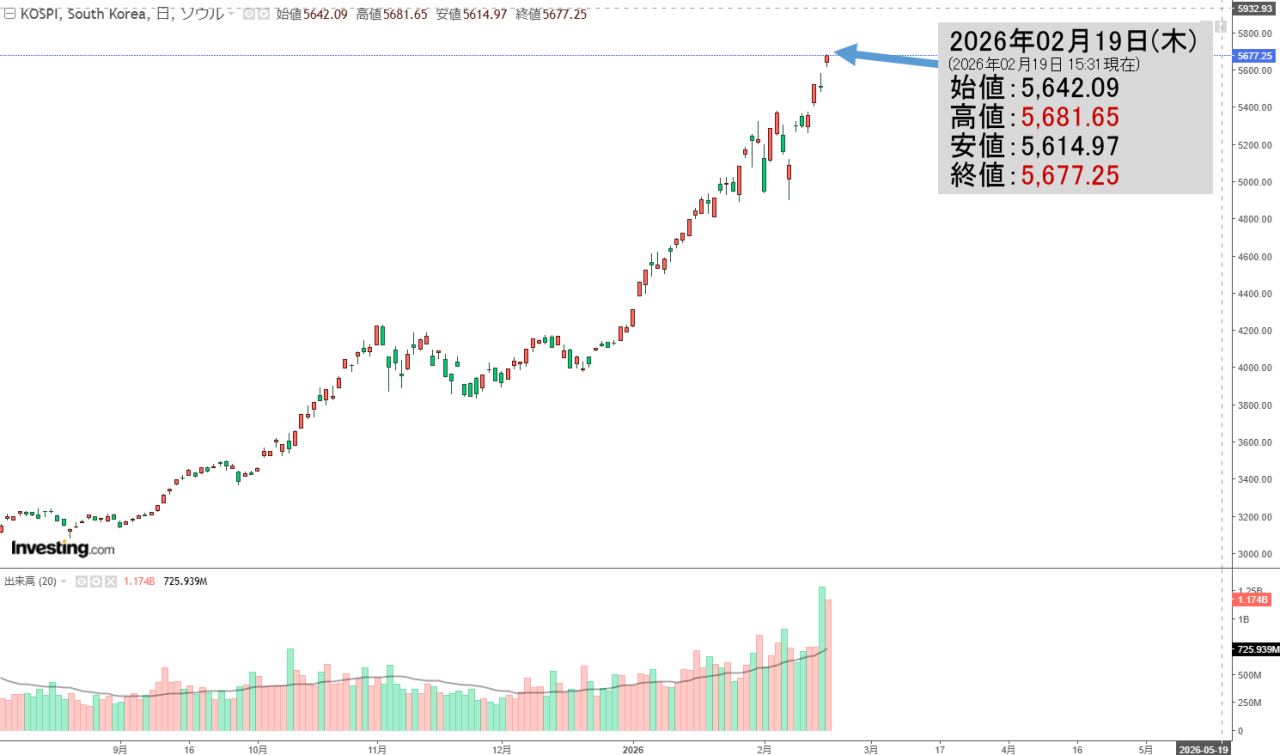 2026年02月19日(木)の韓国株式市場が締まりました。15:31現在、KOSPI(韓国総合株価指数)のチャートは以下のようになっています(チャートは『Investing.com』より引用)。