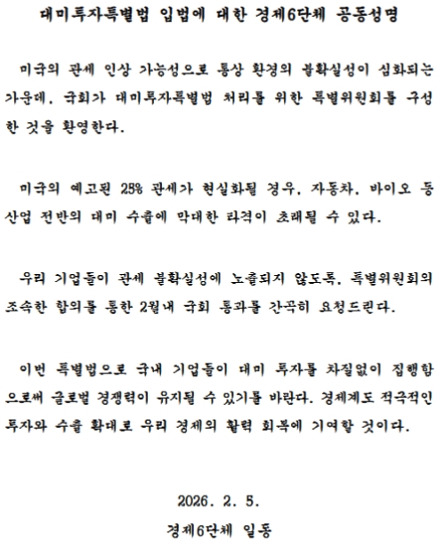 2026年02月05日に出した「対米投資特別法立法に対する経済6団体の共同声明」というものです。