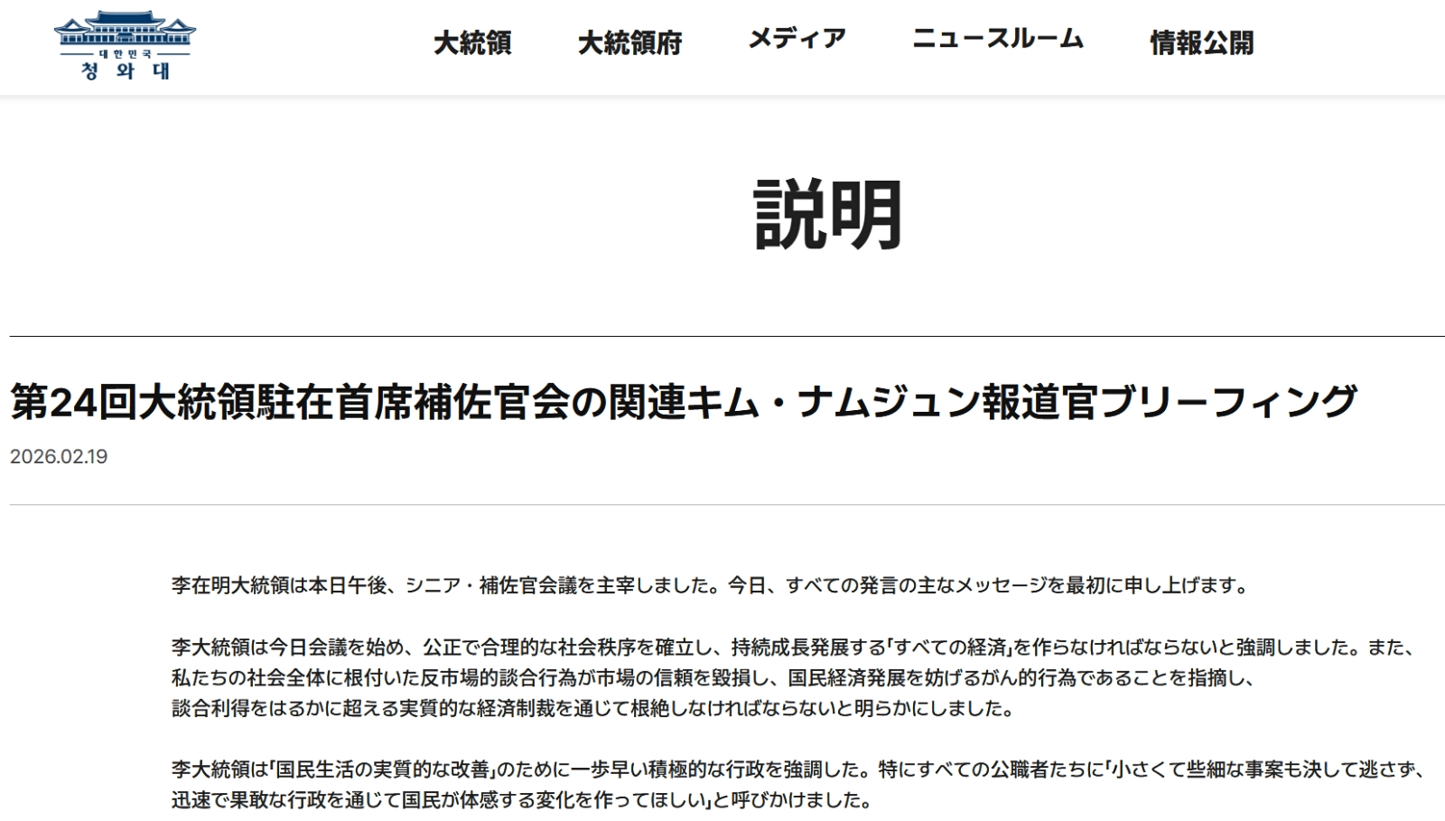 2026年02月19日李在明(イ・ジェミョン)大統領は本日午後、首席・補佐官会議を主宰した。本日の冒頭発言の主要メッセージをまず申し上げる。