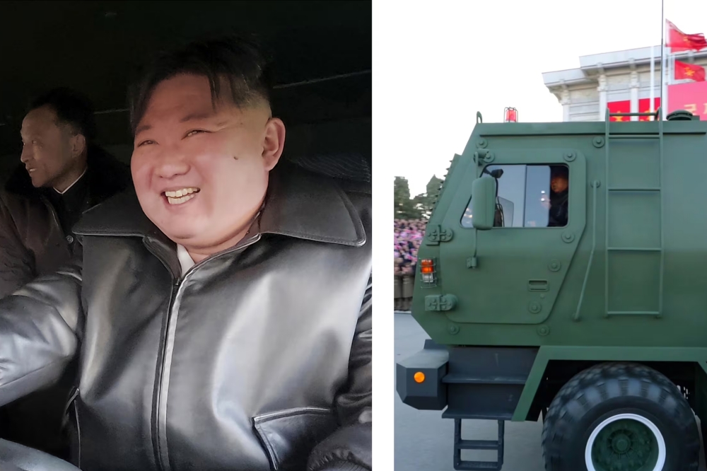 演説を終えて演壇を下りた革ジャン姿の金正恩さんは、自ら運転席に乗り込み、閲兵する姿を見せました。広場の周辺を一周した金正恩さんは、笑顔でサムアップ。