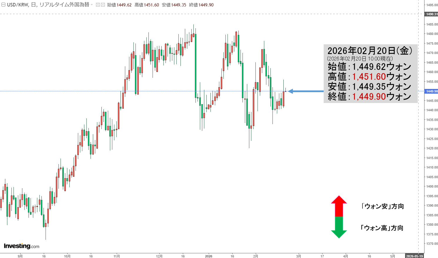「ドルウォン」02月20日(金)初動・「1,449ウォン」1,450手前の上下。
