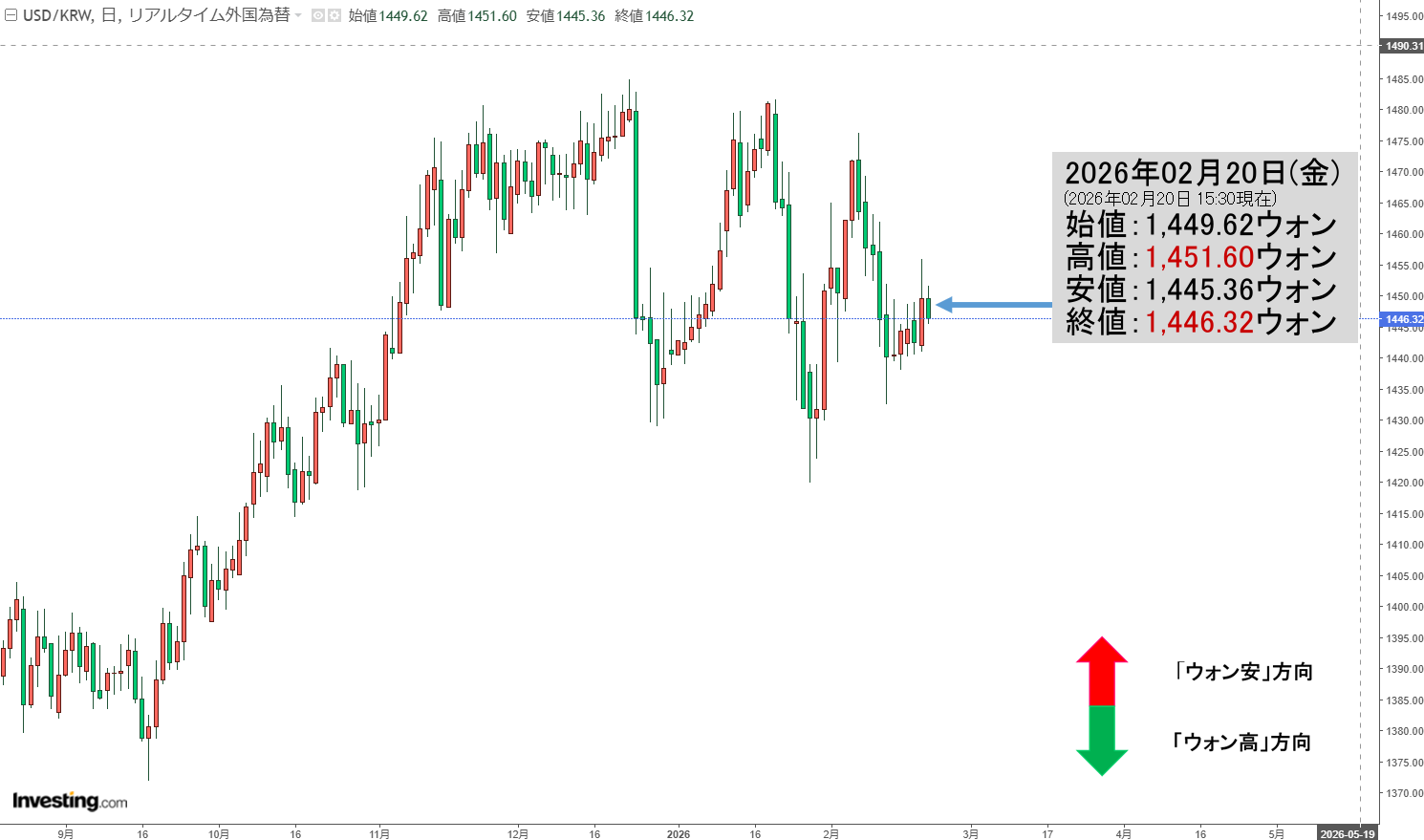 2026年02月20日(金)15:30現在、ドルウォンのチャートは以下のようになっています(チャートは『Investing.com』より引用)。