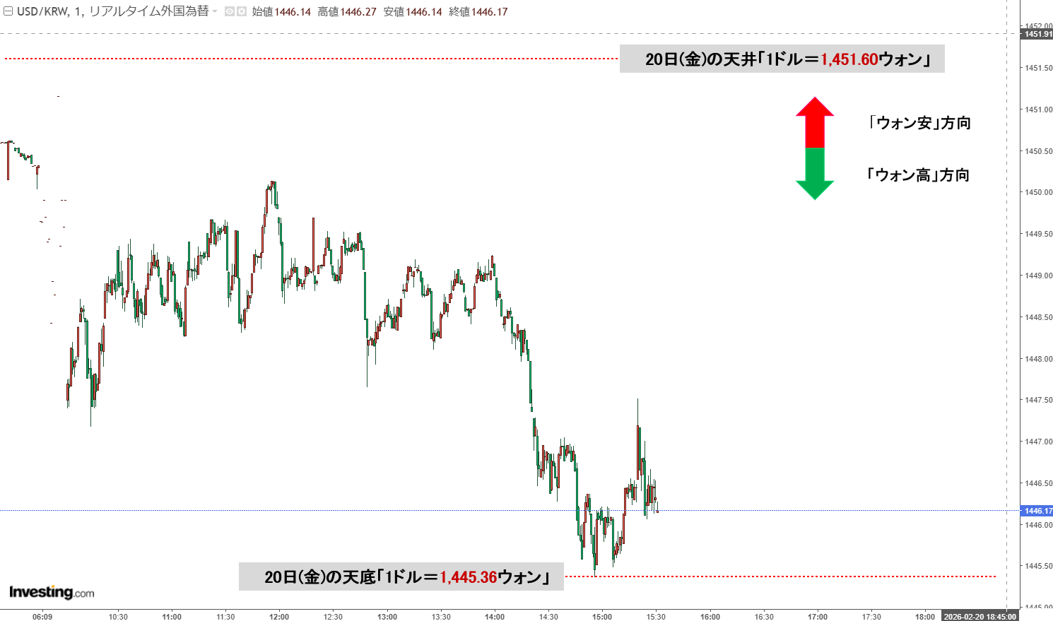 現在の天井は「1ドル=1,451.60ウォン」、天底は「1ドル=1,445.36ウォン」です。