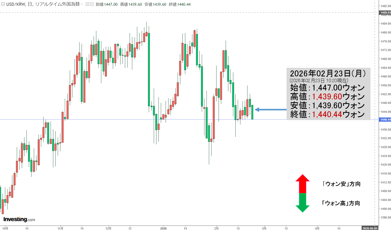 「ドルウォン」02月23日(月)初動・「1,440ウォン」陰線。 広告 トピック X Facebook はてブ Pocket LINE コピー 2026.02.23 おススメ記事 『Money1』 「相互関税」違法判決でウォン高方向に動くのでは――という話。 『Money1』 ロシアが韓国で「われわれは勝つ」掲げる。 『Money1』 「台湾に謝謝、中国にも謝謝」の韓国、米国提案「日米韓軍事訓練」を拒否 『Money1』 米国は二段階で相互関税を代替するつもり ⇒ カツアゲは止まらない。 『Money1』 北朝鮮・三代目が「ミサイルを1本足した新兵器」を軍に贈呈。 『Money1』 韓国には海苔の養殖などないも同然だった。育てたのは朝鮮総督府。 『Money1』 米国連邦最高裁「トランプ政権の相互関税は法律違反」⇒ それでもトランプはカツアゲを諦めない。 『Money1』 【全文和訳】尹錫悦前大統領・無期懲役の判決を受けての言葉 ⇒「韓国に自由民主主義が確固として立ち、法治主義が正しく確立する日、私の判断と決断に対する再評価を改めて期待する」 『Money1』 【斜め上の展開】米国・韓国・ギリシャの造船協力 ⇒ 米海軍のフリゲート艦をギリシャで造る? 『Money1』 韓国『国民の力』張東赫は正面突破を選択。⇒ 『共に民主党』はさっそく「内乱罪には恩赦なし」法案を司法委員会に。 『Money1』 中国「いかなる口実を設けて集団的自衛権を行使し、台湾問題に介入しようとも、それは中国に対する侵略だ」⇒ 違うよ。 『Money1』 トランプ大統領「韓国の関税は25%だ」投稿の前に、韓国政府が対米投資を拒否していた。「国会で対米投資特別法が可決していないので無理っス」 『Money1』 韓国・李在明「談合するヤツは経済制裁で根絶する」 『Money1』 韓国「対米交渉で3三振」⇒ 6経済団体が共同で嘆き節「自動車・バイオなど産業全般の対米輸出に莫大な打撃」 『Money1』 韓国「日本が先に優良な対米投資先を奪ってしまう」⇒ さっさと200億ドル払え。 『Money1』 韓国司法「内乱裁判」無期懲役から無罪まで ⇒ 元反米テロリストが「最低の判決だ」と罵詈雑言。 『Money1』 【速報】韓国いわゆる「内乱裁判」第一審が決着。尹錫悦前大統領に対して「無期懲役」判決。 『Money1』 外国人投資家は韓国株式の売却を継続「3カ月で10兆ウォン」⇒ ところが珍現象が発生。 『Money1』 『韓国銀行』がインドネシア中央銀行との通貨スワップ契約を延長更新 ⇒ 契約期間を5年に拡大。10.7兆ウォン/115兆ルピア 『Money1』 『韓国GM』強硬労組が「物流センター」を占拠!⇒ 2018年に韓国から撤退すべきだった。 『Money1』 中国「2025年3Qは証券投資で1,908億ドルも資金が外国へ」 『Money1』 韓国の2025年第4四半期の経済成長率、世界主要国の最下位圏に転落 『Money1』 韓国「日本軍慰安婦問題に関する虚偽事実を流布し、または名誉を毀損し、もしくは侮辱する行為(以下「二次加害」という)を行った者は、5年以下の懲役または5,000万ウォン以下の罰金に処する」法律可決。 『Money1』 韓国・李在明が『X』投稿に注力して炎上多数。 『Money1』 接続不良が発生しておりました。誠に申し訳ありません 『Money1』 中国への直接投資は「95%減少」⇒ 現在も絶不調。 『Money1』 中国「FORGEの規則による国際経済・貿易秩序の破壊に反対する」⇒ 効いてる効いてる 『Money1』 韓米関税交渉「苦闘しているのは韓国だけではない。日本もだ」 『Money1』 韓国放送局「日本の国旗を出してしまい。すみませんでした」 『Money1』 韓国政府「“相続税負担による資産家流出、世界4位”はウソだ」 『Money1』 韓国「中国を包囲するレアアースサプライチェーン」に逃げ腰 ⇒ 中国からぶん殴られるから。 『Money1』 韓国政府「関税25%問題に手をこまねいていたわけではない。あれは不意打ちだった」 『Money1』 韓国史上最大の代位弁済金額「1兆5,677億」⇒ 韓国の中小・ベンチャー経営環境の悪化。 『Money1』 【中国の外貨準備】919億ドルの激増「3兆8,362.81億ドル」⇒ なぜこれほど増えたのか?「理由は金価格の上昇」 『Money1』 米国「合衆国海事行動計画」を発表。⇒ 韓国「これで造船業がもうかる」と大喜び。 『Money1』 韓国「日本は復活する一方で韓国は停滞の泥沼にさらに深く沈む構図」⇒ もはや日本から学ぶものはない……ではなかったのか。 Fact1 日本の誇る海洋資源調査船『白嶺』は先進技術の塊! Fact1 夏の甲子園、優勝校を最も多く輩出している都道府県とは? Fact1 今話題の「楽天ライオンズ」とは? Fact1 奇跡の毛色「白毛馬」とは? Fact1 全て勝つといくら? 競馬GI競走で勝利騎手がもらえる賞金とは? Fact1 平成仮面ライダーの意外すぎるモチーフとは? Fact1 発表から2日で大崩壊、鳴かず飛ばずに終わりそうなスーパーリーグとは? Fact1 日本人マスターズ挑戦の歴史。松山以前に最高位だった選手とは? Fact1 甲子園通算本塁打、最多の清原に次いで多く打っている意外な選手とは? Fact1 セレクトセールの高額取引馬が稼いだ金額とは? 2026年02月23日(月)の市場が開きました。10:20現在、ドルウォンのチャートは以下のようになっています(チャートは『