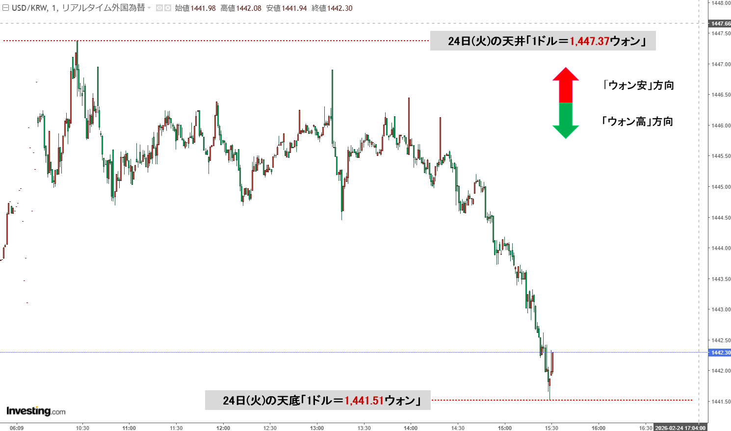 現在のところ「1ドル=1,441ウォン」近辺の攻防となっています。