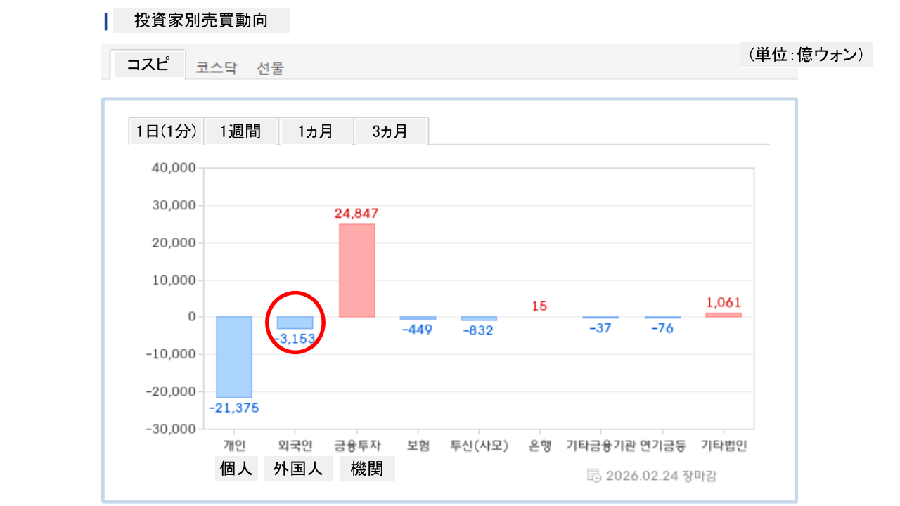 個人投資家は「2兆1,375億ウォン」の売り越し、外国人投資家は「3,163億ウォン」の売り越しです。