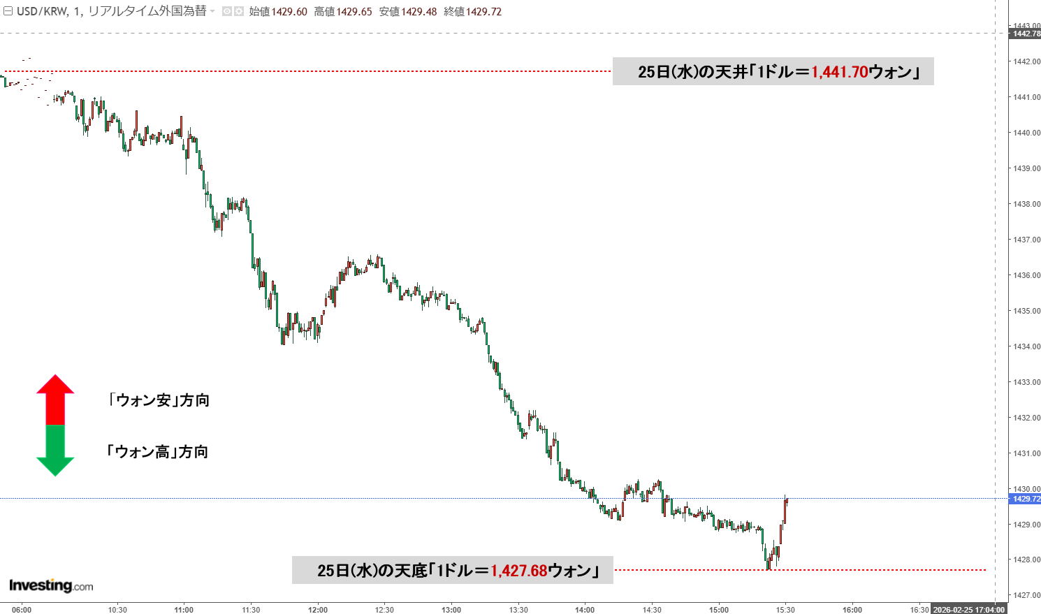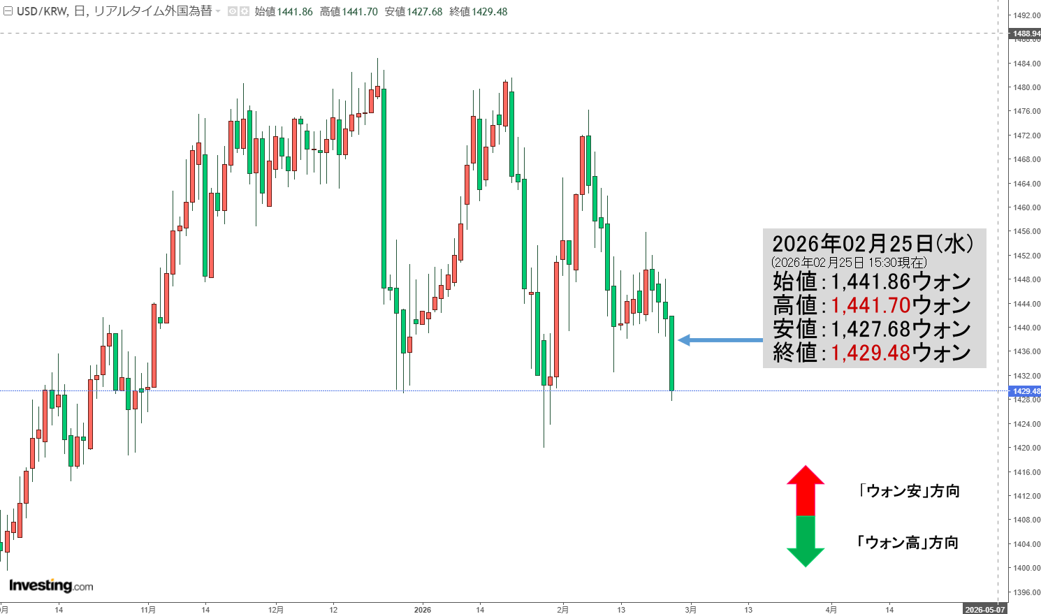 2026年02月25日(水)15:30現在、ドルウォンのチャートは以下のようになっています(チャートは『Investing.com』より引用)。