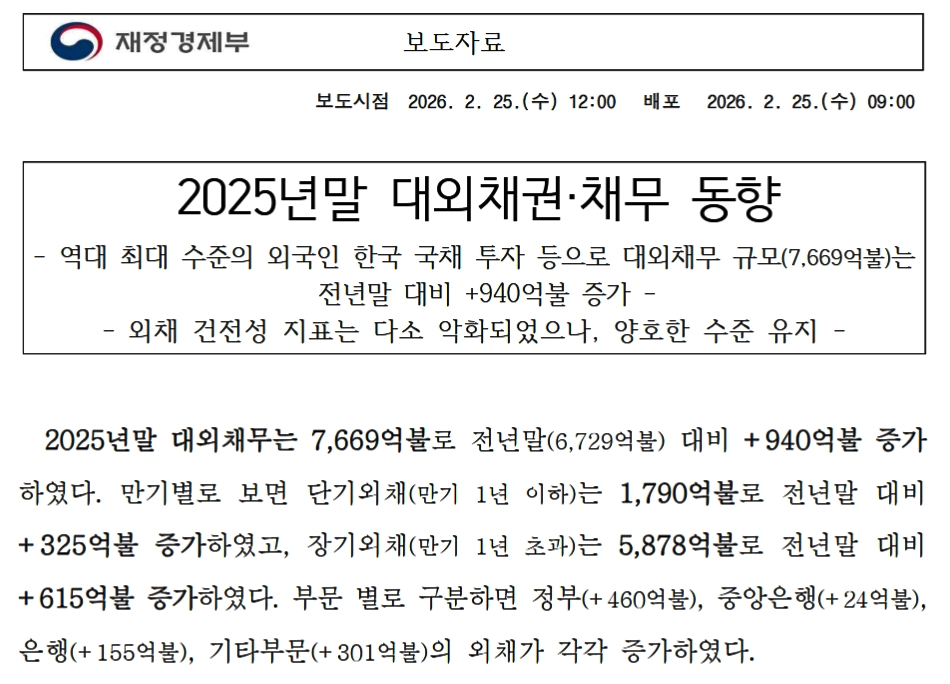 2026年02月25日、韓国の財政経済部(企画財政部から改組)が「2025年末時点の対外債権・債務の動向」というプレスリリースを公開しました。