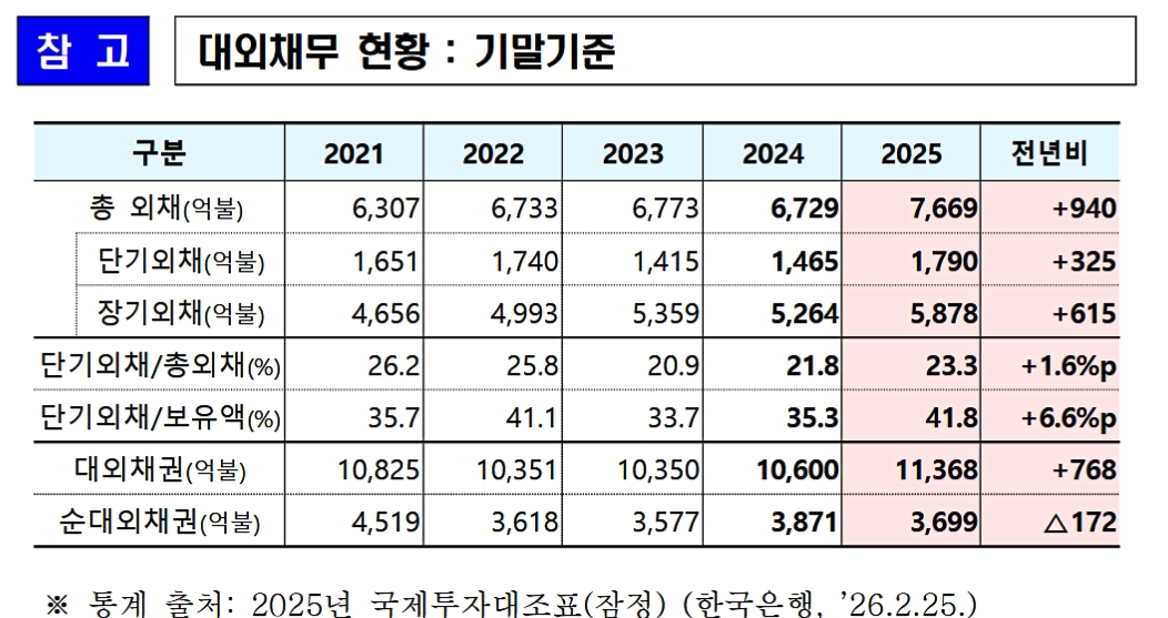 2025年末の対外債務は7,669億ドルで、前年末(6,729億ドル)比+940億ドル増加した。