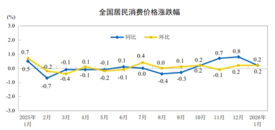 中国の国家統計局が2026年02月11日に2026年01月のCPIのデータを公表しています。まず全体像、月次の推移です。