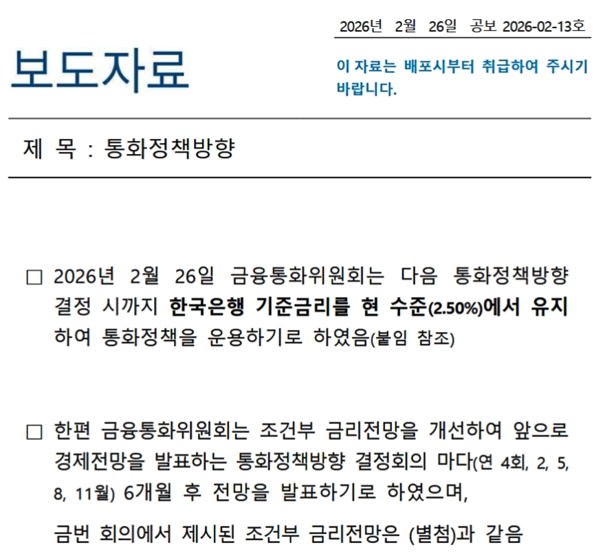 2026年02月26日、韓国の金融通貨委員会は基準金利を「2.50%」で据え置くことを決定しました。