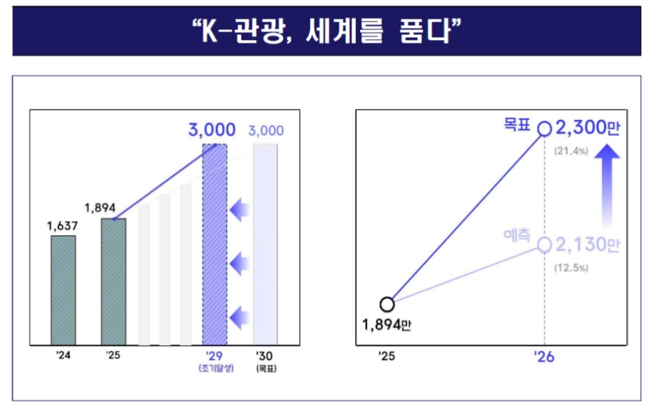2025年の訪韓外国人観光客は1,894万人だったのですが、これを3,000万人にまで増加させようといプランで、しかも2030年までに達成しようという計画だったものを1年前倒しする――というのです。