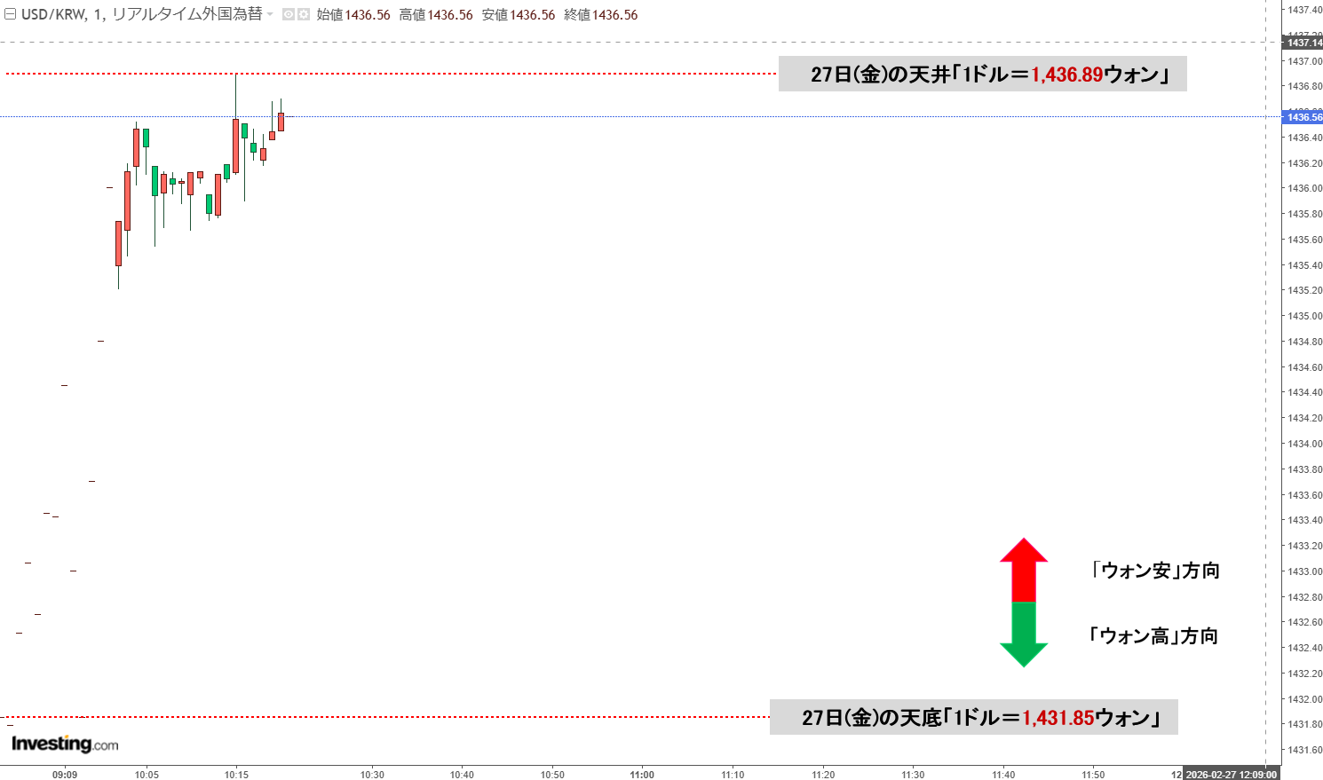 2026年02月27日(金)の市場が開きました。10:19現在、ドルウォンのチャートは以下のようになっています(チャートは『Investing.com』より引用)。