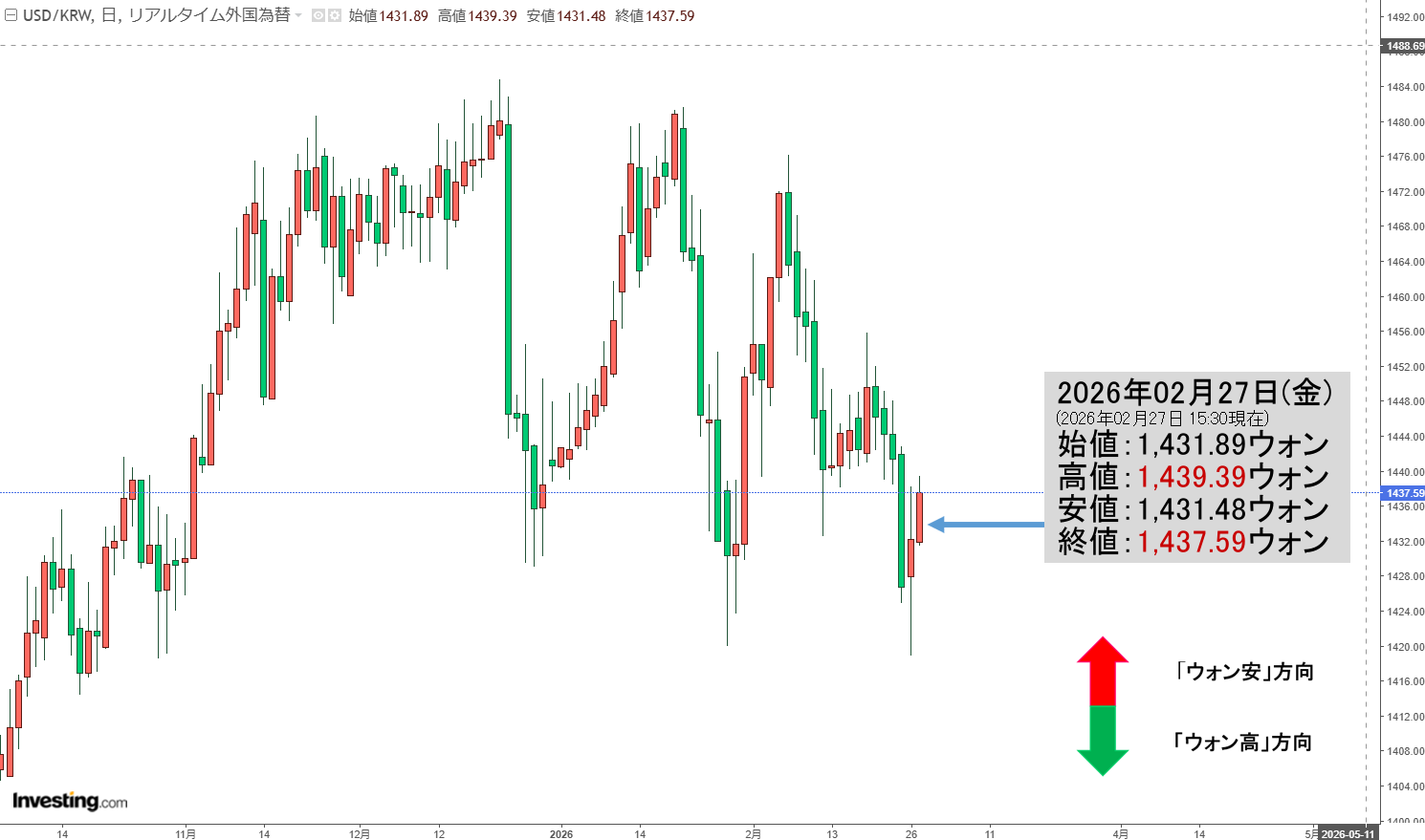 2026年02月27日(金)15:30現在、ドルウォンのチャートは以下のようになっています(チャートは『Investing.com』より引用)。