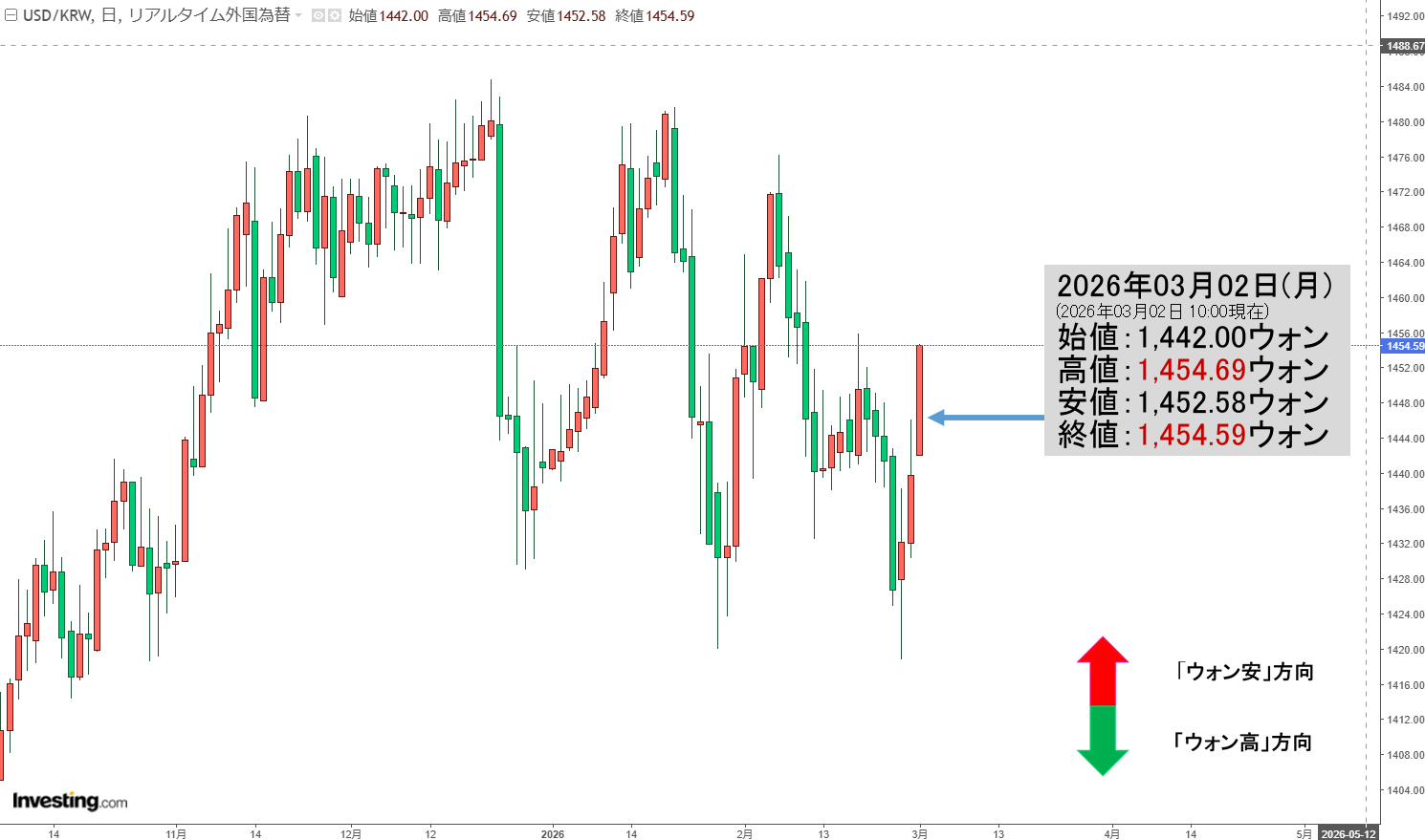 2026年03月02日(月)の市場が開きました。10:00現在、ドルウォンのチャートは以下のようになっています(チャートは『Investing.com』より引用)。
