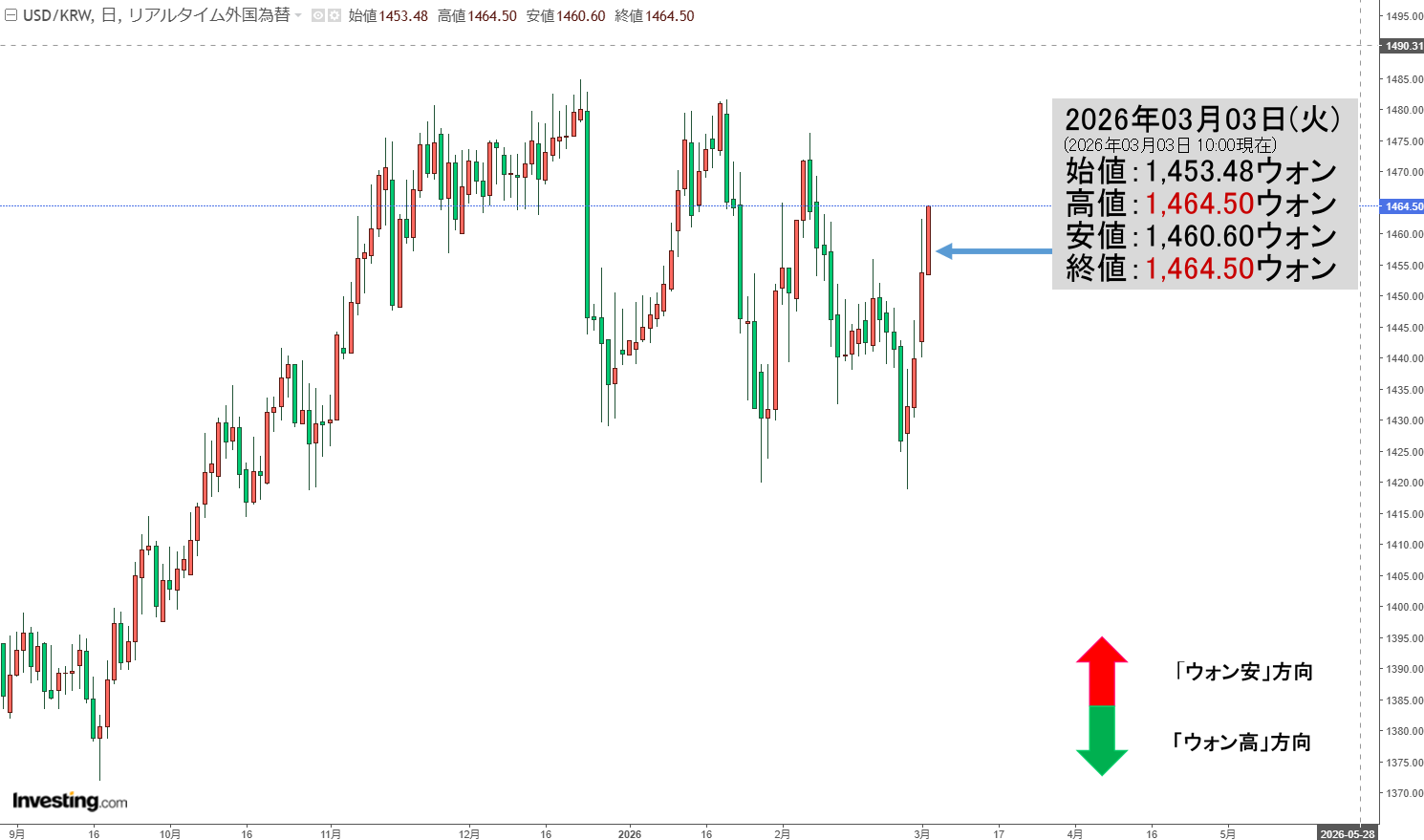 2026年03月03日(火)の市場が開きました。10:00現在、ドルウォンのチャートは以下のようになっています(チャートは『Investing.com』より引用)。