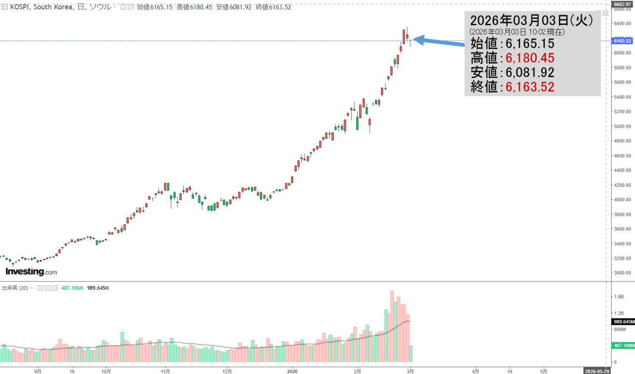 2026年03月03日(火)の韓国株式市場が開きました。10:02現在、KOSPI(韓国総合株価指数)のチャートは以下のようになっています(チャートは『Investing.com』より引用)。