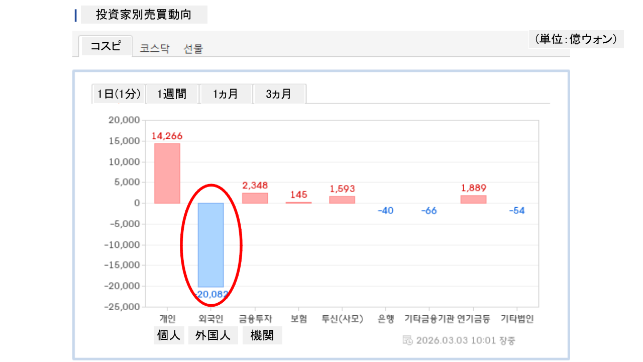 個人投資家は「1兆4,266億ウォン」の買い越し、外国人投資家は「2兆82億ウォン」の売り越しです。
