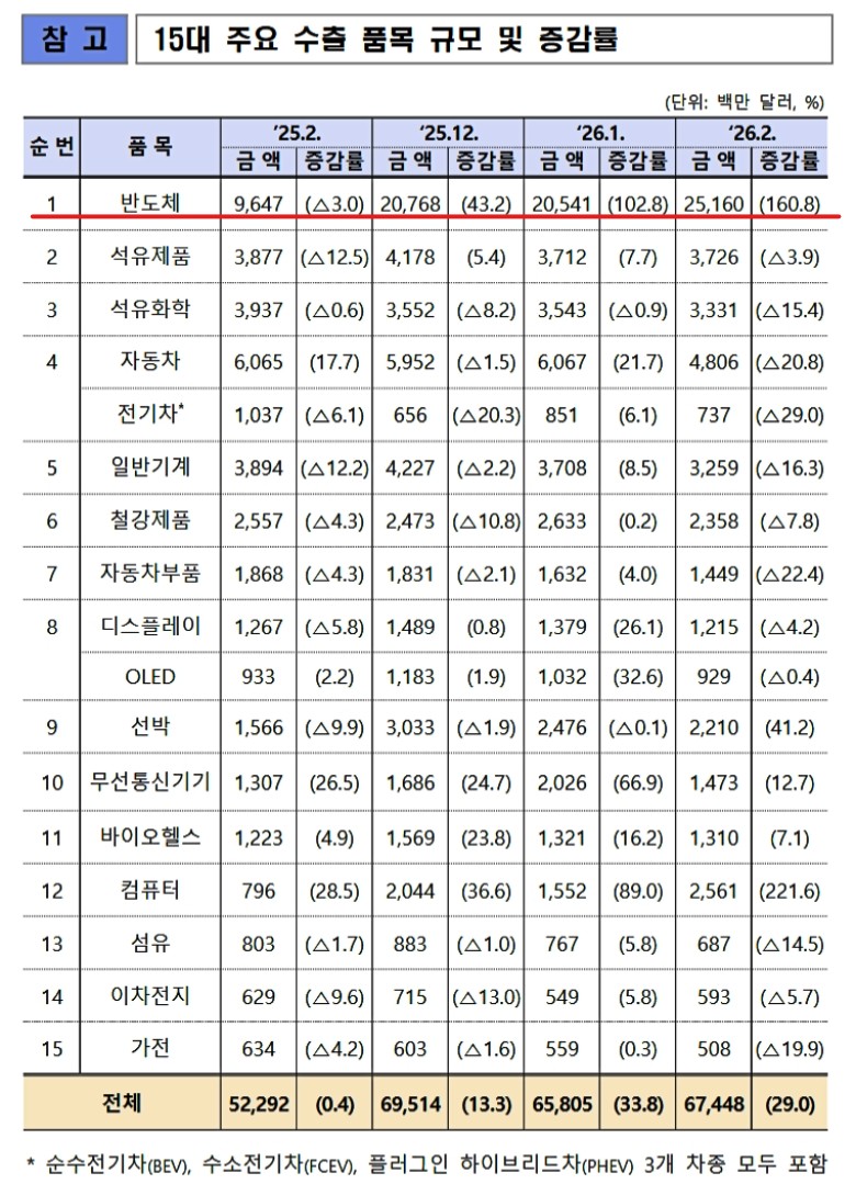 ↑2026年02月の15大輸出品目の輸出額の表組。赤いアンダーラインを引いてあるのが「半導体」です。※データ出典は同上