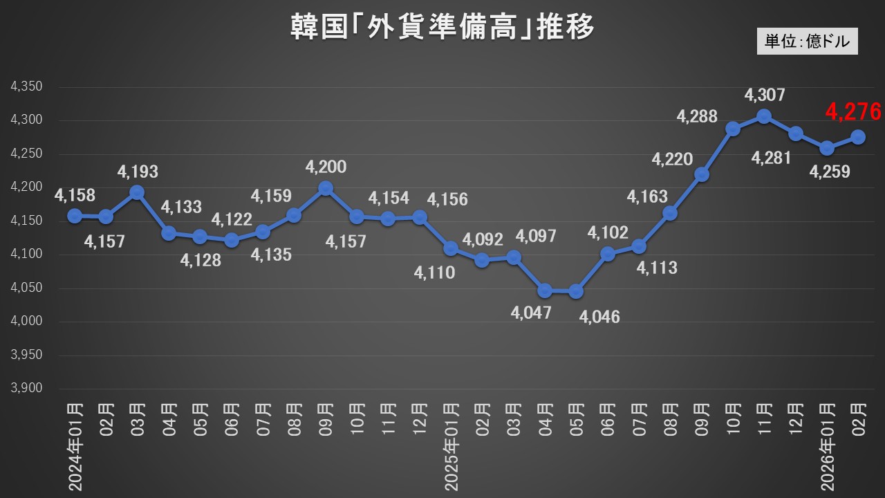 2026年03月05日、『韓国銀行』が「2026年02月の外貨準備高」を公表しました。
