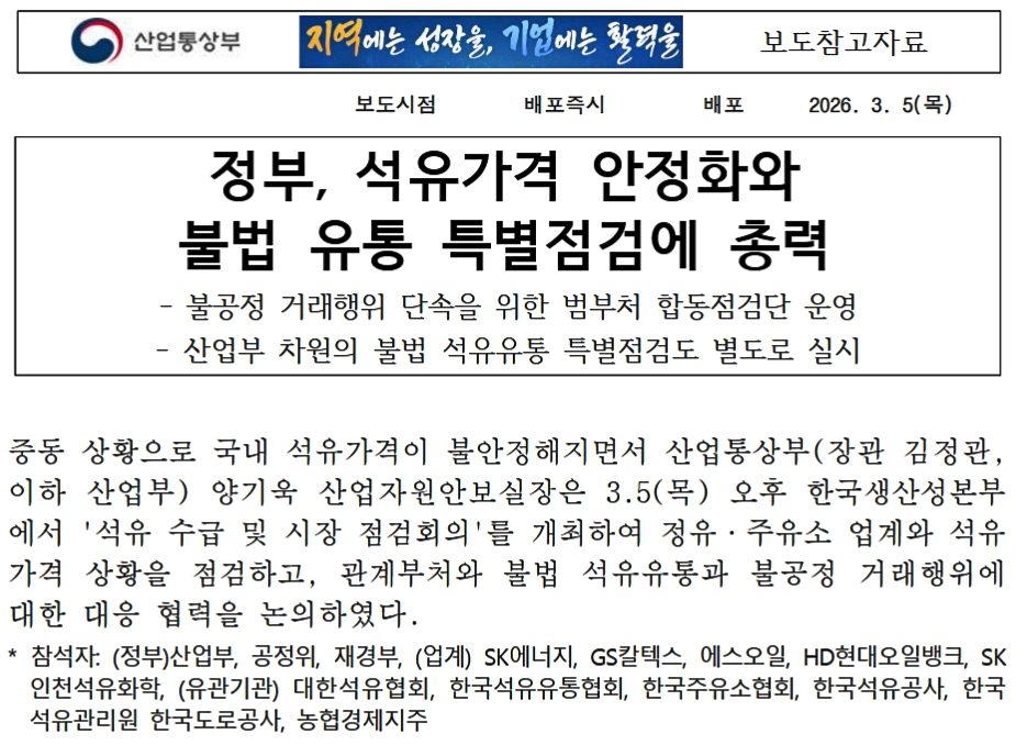 2026.03.05 産業通商部政府は国内石油価格の安定化と違法流通に対する特別点検に乗り出す。