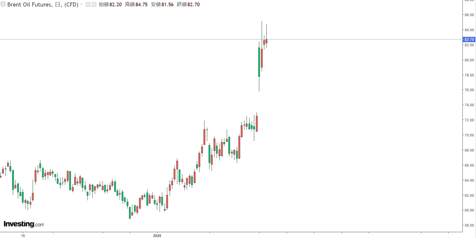上記は2026年03月05日19:29時点でのブレント原油先物の価格チャートですが、03月02日にギャップアップして天井の戦いが続いています(チャートは『Investing.com』より引用)。
