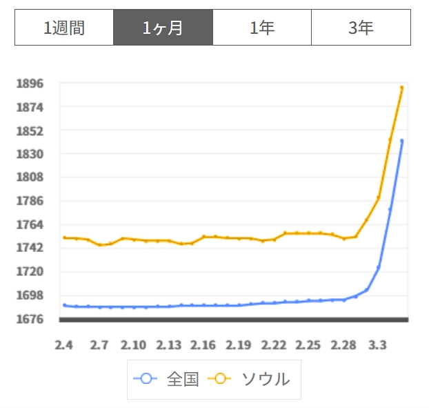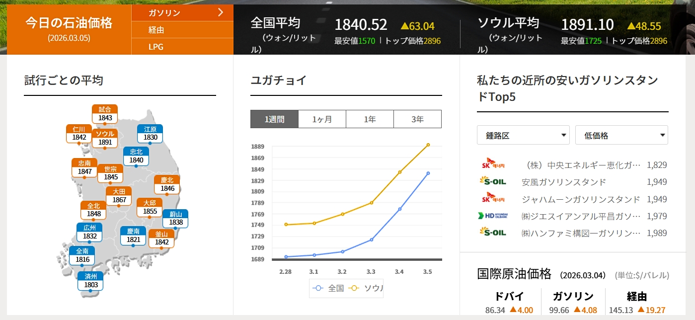 2026年02月28日時点でリッター当たり韓国平均価格「1,693ウォン」で、03月05日時点では「1,841ウォン」で約8.7%上昇しました。