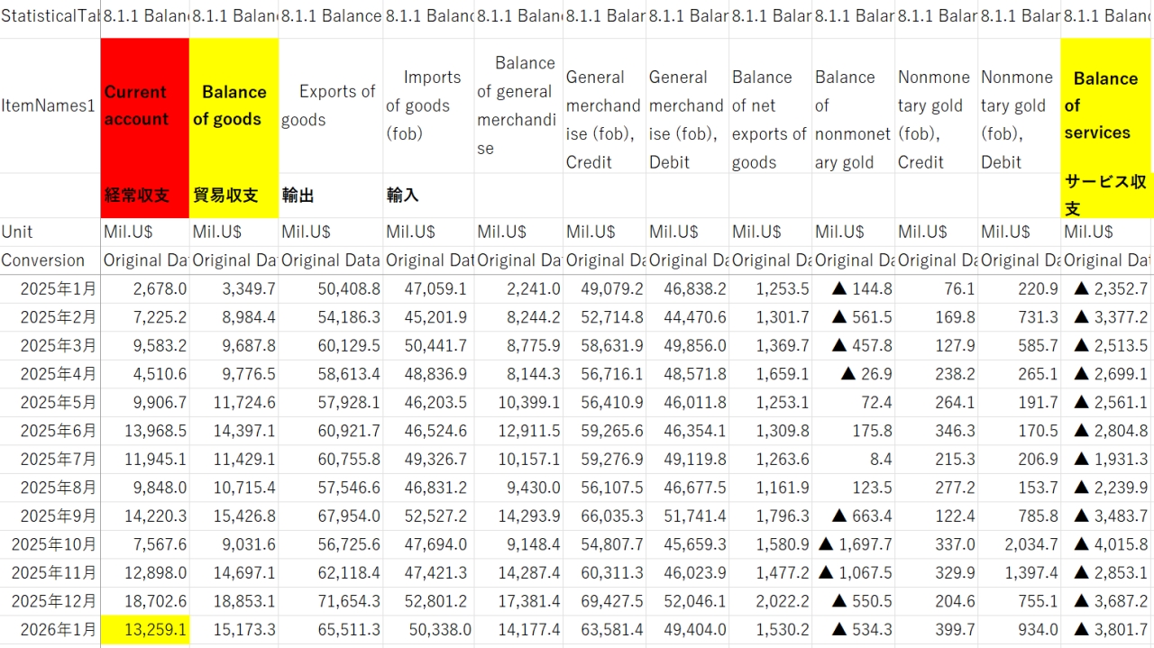 2026年03月05日、『韓国銀行』が「2026年01月の国際収支統計」のデータを公表しました。2026年一発目のデータはどのようになったでしょうか。以下が経常収支です。