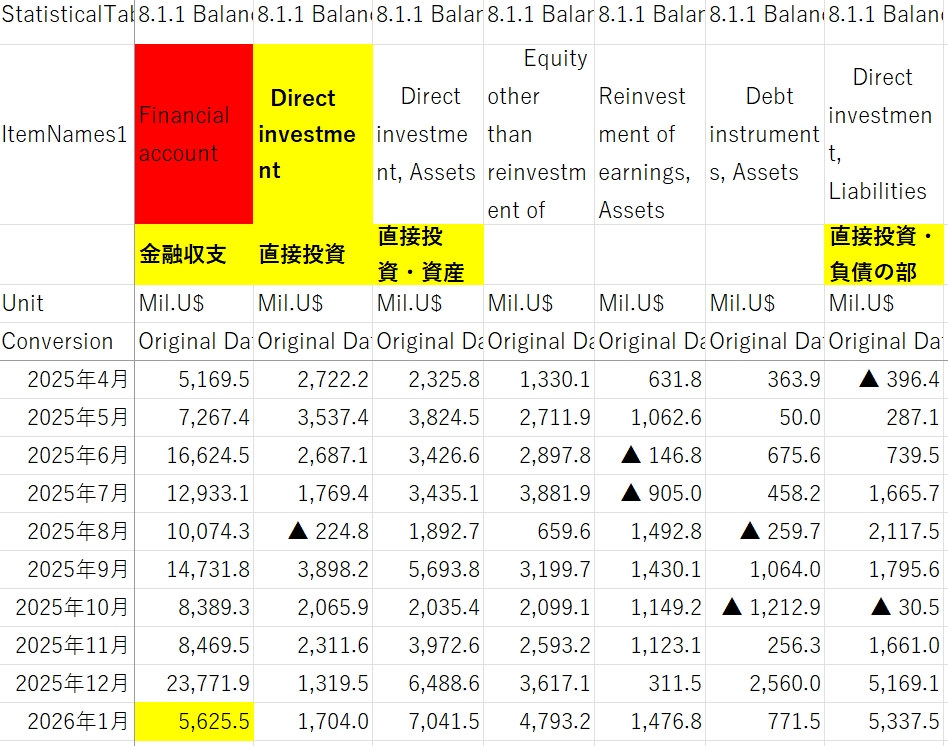 上掲のとおり、2026年01月の金融収支は「56億2,550万ドル」しかありません。