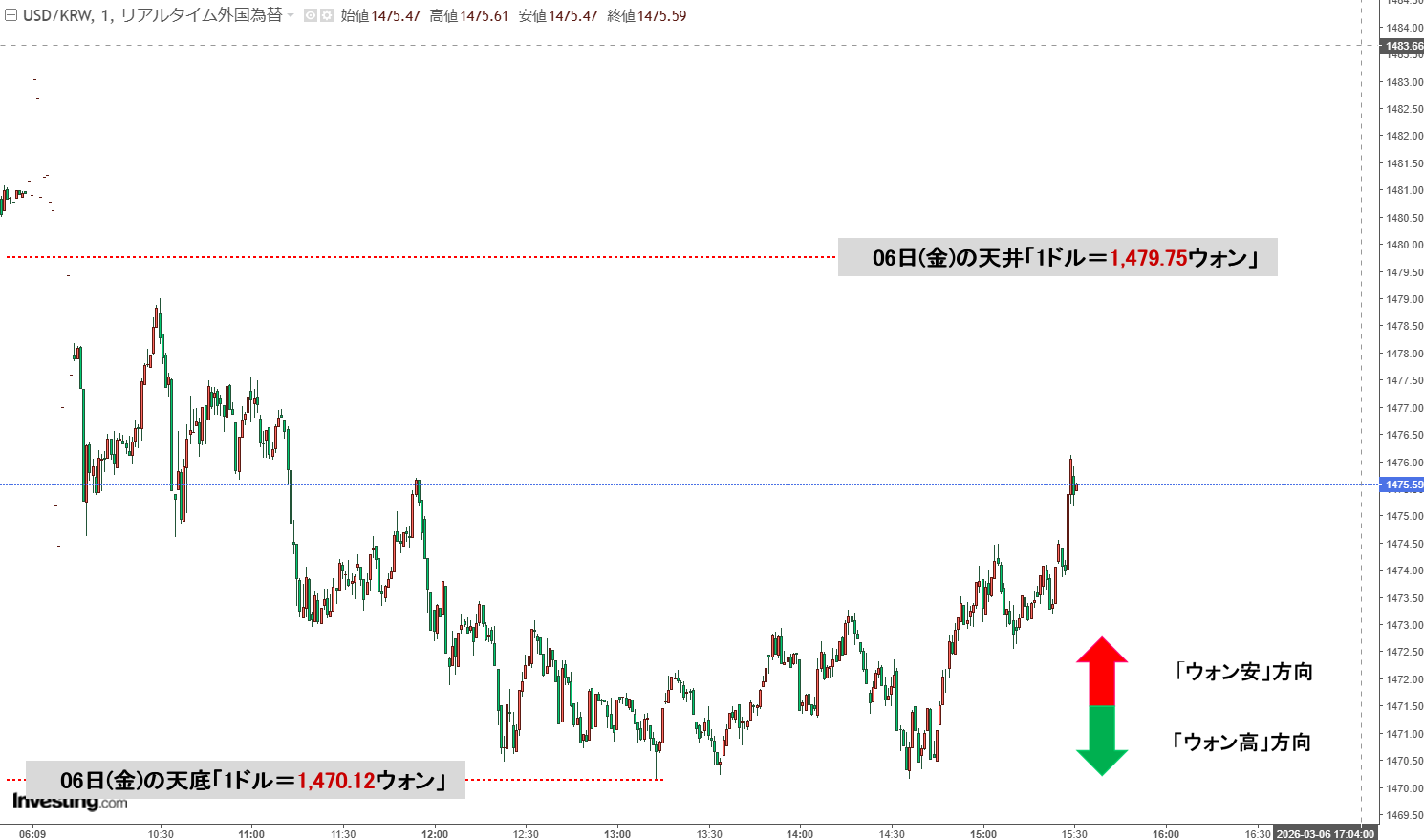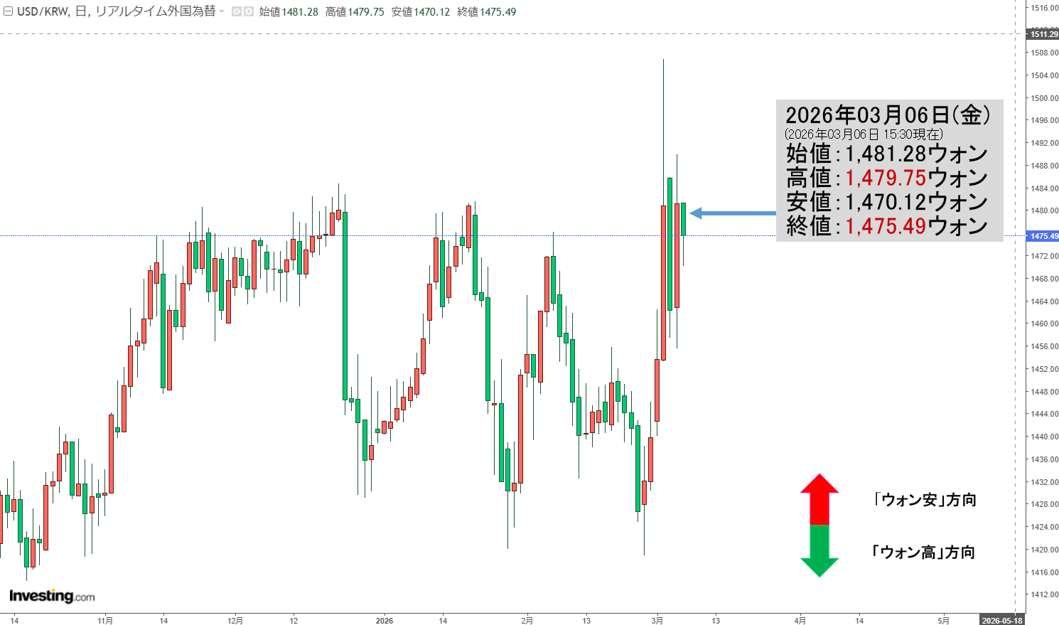 2026年03月06日(金)15:30現在、ドルウォンのチャートは以下のようになっています(チャートは『Investing.com』より引用)。